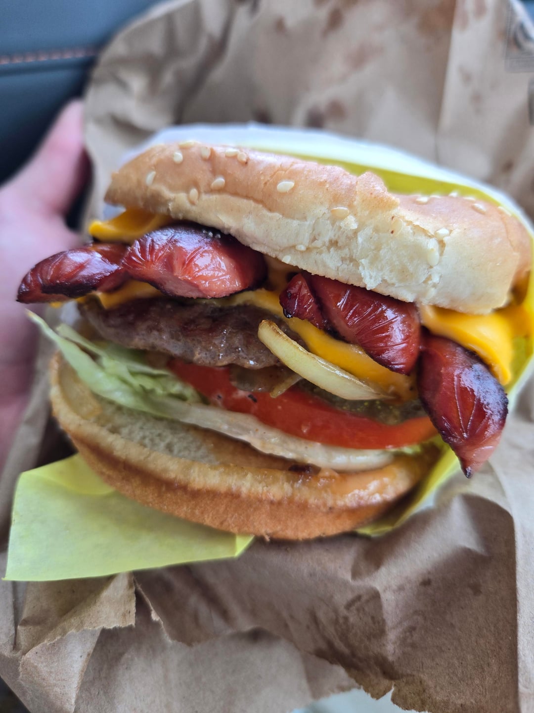 We really can't give Long Beach its own location tag? Anyway, this is a truly phenomenal burger. Everything is balanced in perfect proportion, which is impressive given that there's a split grilled hot dog on it. But somehow, it doesn't just feel like a mountain of meat, the hot dog somehow meaningfully contributes to the seasoning of the overall burger. Seriously I've had many of LA's great burgers and this is without a doubt somewhere near the very top. Like top 3 burgers in all of LA County. The fact that it's in a gas station parking lot somehow adds to it.