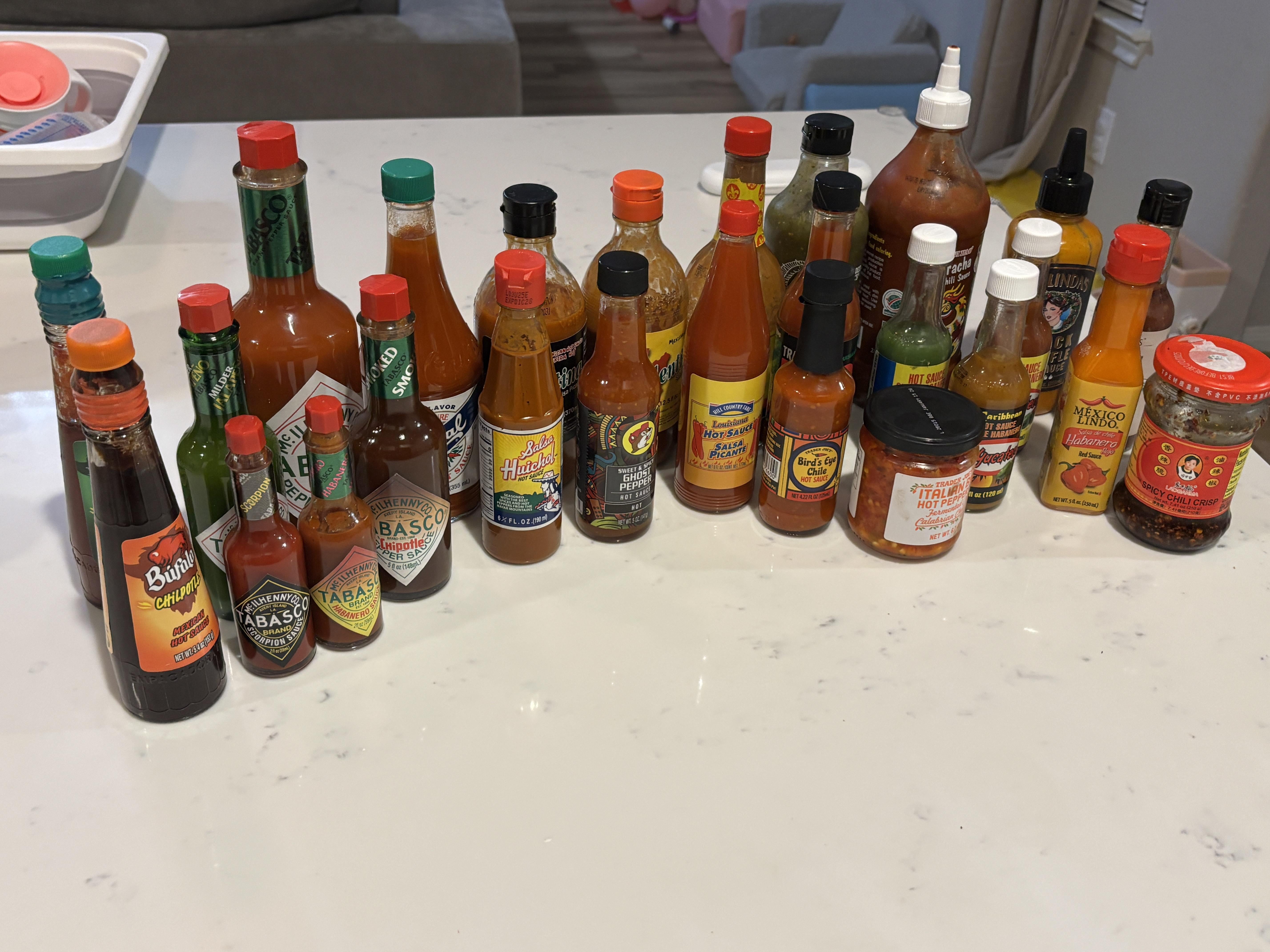 I love how the Tabasco scorpion is unopened lol. At first that stuff would light me up, but since my tolerance went up I’ve been dousing everything in that and Melinda’s ghost pepper.