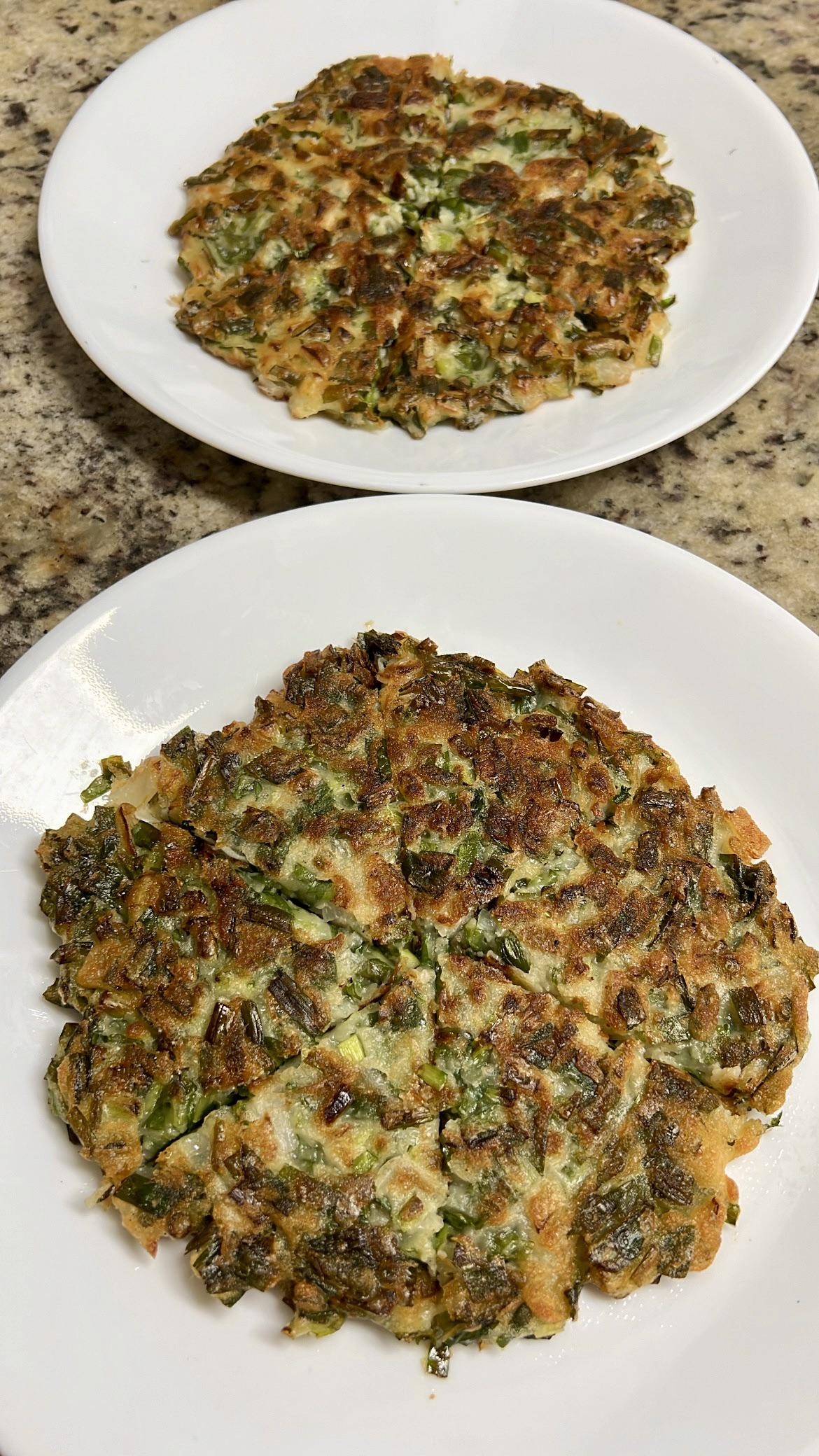 Share Facebook Twitter Pinterest LinkedIn Reddit Just flat chives from the in-laws’ garden, flour, onion, water, and seasonings. I served the pancakes with a dipping sauce 🤤 by overthinkingrobot Dining and Cooking
