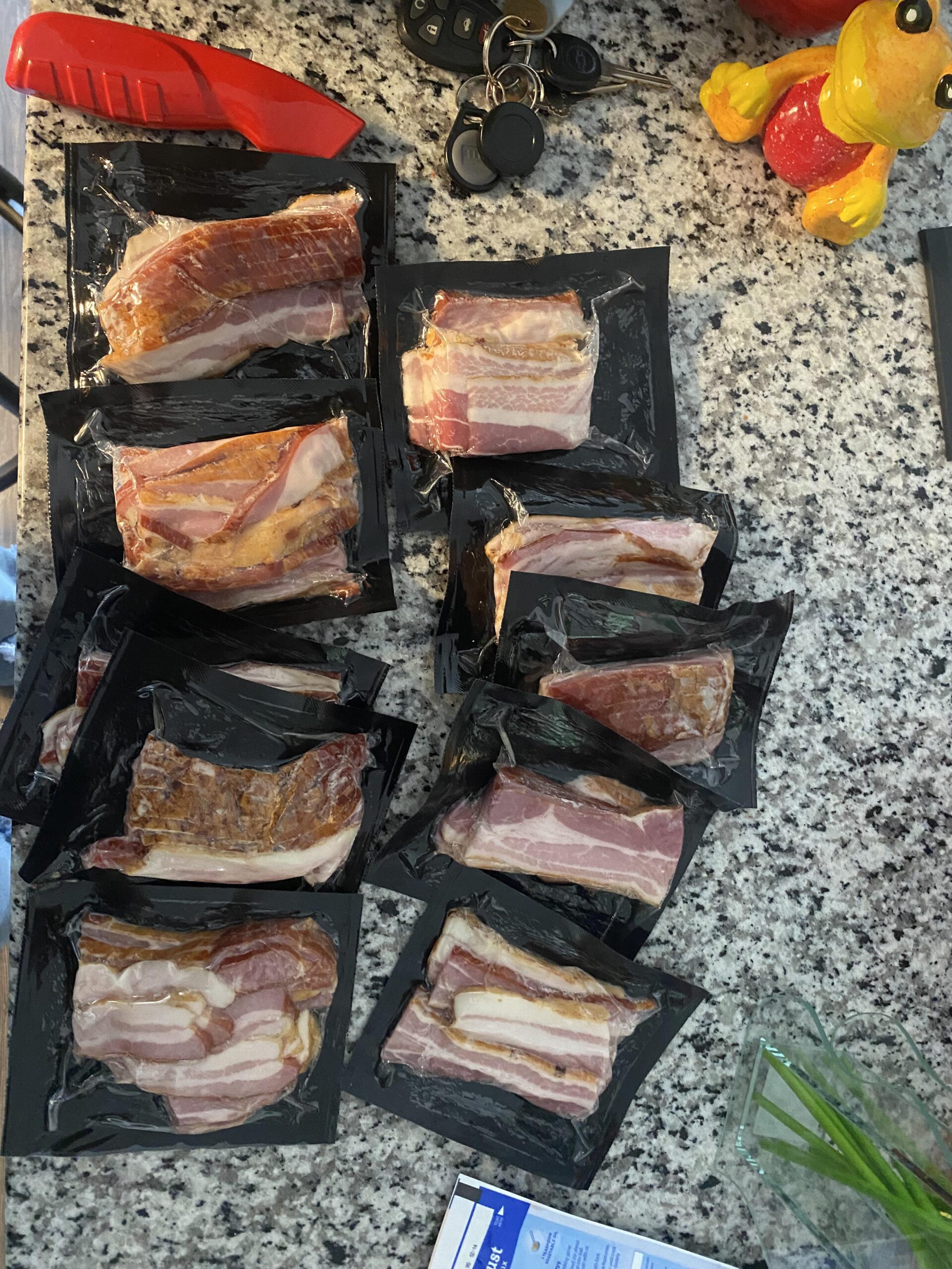 I opened my box for this week and received ten packages of bacon instead of chocolate chip muffins. I thought you guys would get a kick out of this mistake. Also what am I supposed to do with all this bacon?