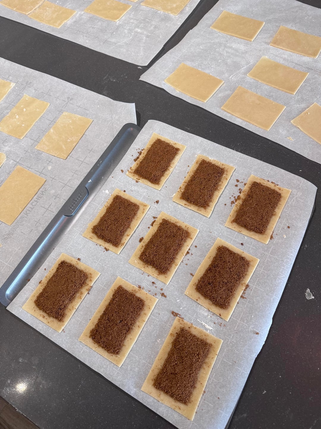 Started with pie crust, as that’s what most homemade versions use, but it wasn’t quite the Pop-Tart texture I was going for. Switched to a sweet, tender shortcrust pastry and that seemed to work. Brown sugar cinnamon filling, finished with a cinnamon royal icing and sanding sugar.