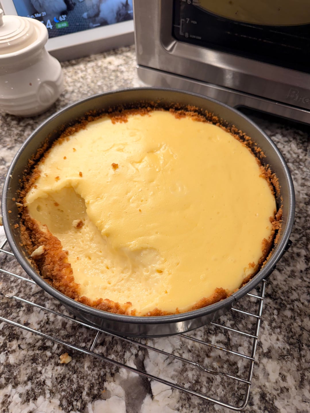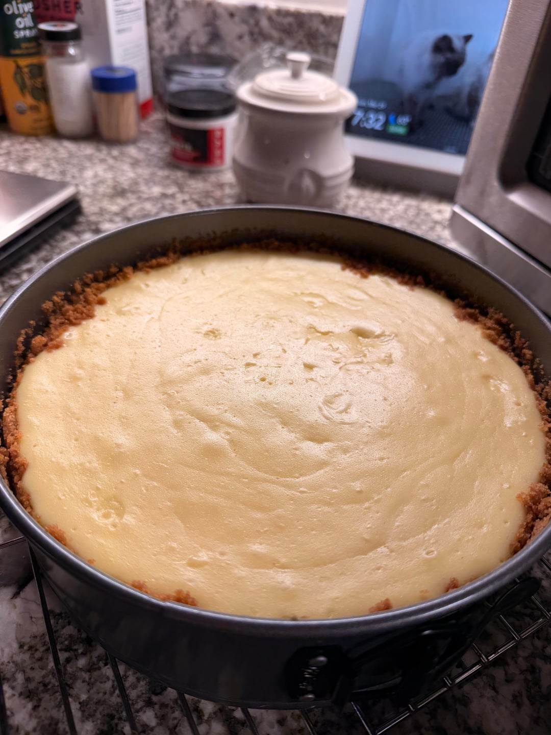 I make it, bake it, things are looking good! Let it cool in the oven with the door cracked for an hour before taking it out of the water bath and setting it on a cooling rack on the counter.