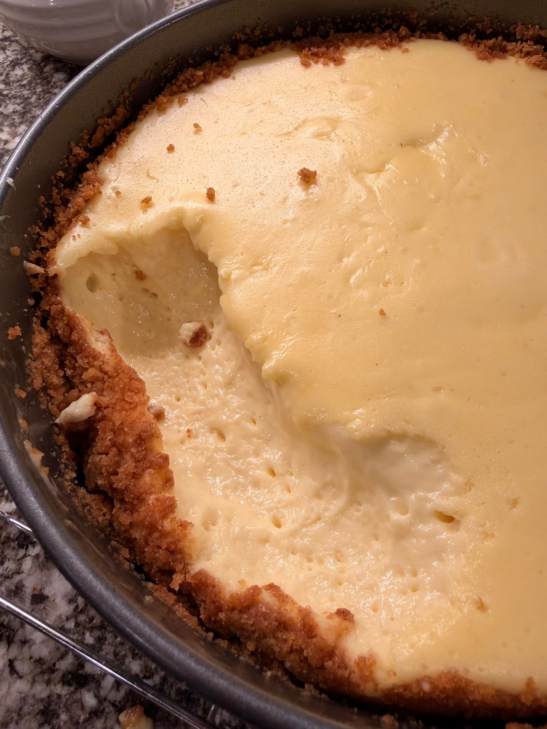 I’m uncertain if I’ve underbaked it or not but as it continues to cool at room temperature, the jiggle firms up, the surface goes matte, there is no sinking or cracking. I decide that I’m going to leave it be for another hour or two and then put it in the fridge to chill. That’s when I made a huge mistake. I texted my BFF that I think it’s going to turn out well.
