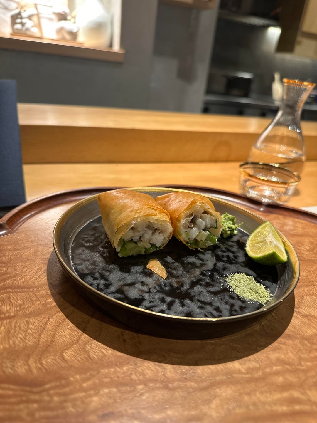 2. Unagi harumaki filled with Takenoko, soramame and another bean. There’s was a sauce of nanoha and other stuff, a sansho salt and sudachi. This was insanely good, literally everything tasted good together as long as you didn’t combine them all in one