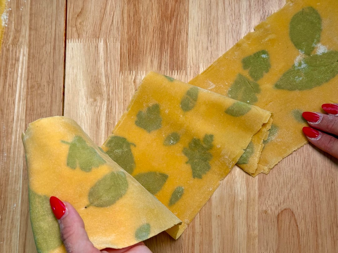 You’ll see the herbs press and stretch into the dough, creating delicate, almost textile-like patterns throughout the pasta.