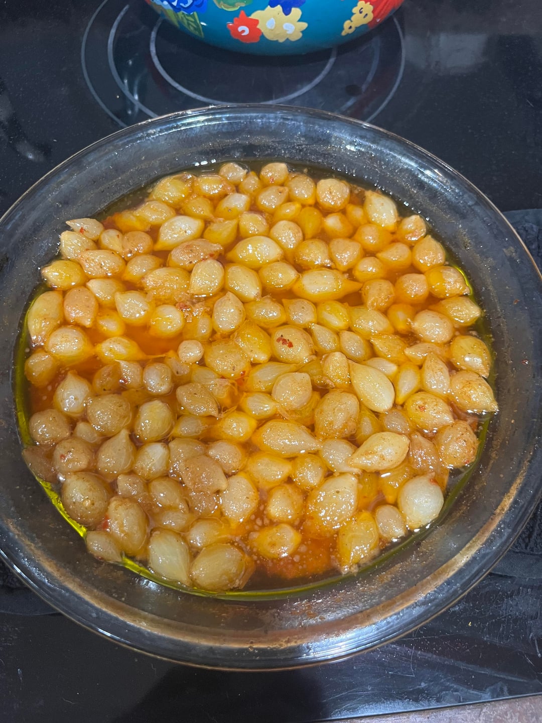 Empty frozen onion pearls (1lb but you can also go crazy here) into an oven safe dish.