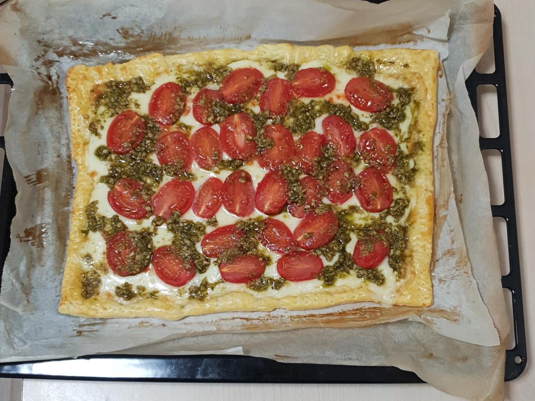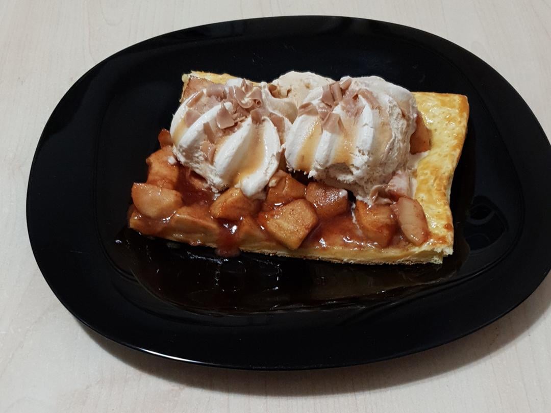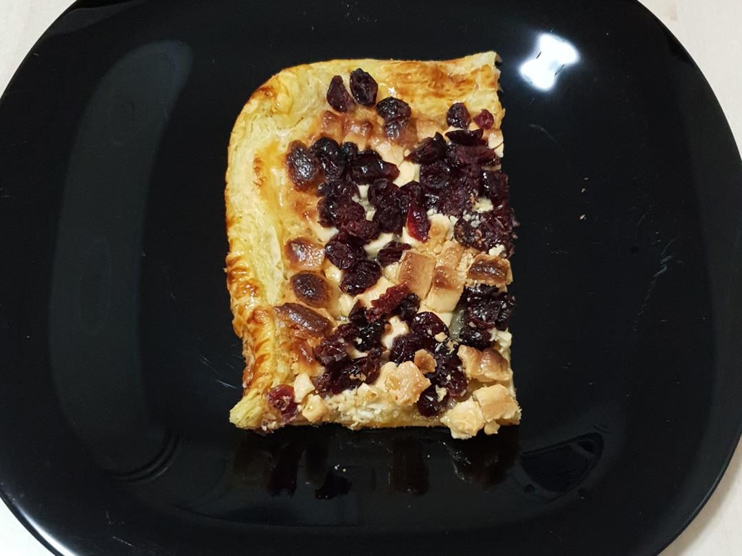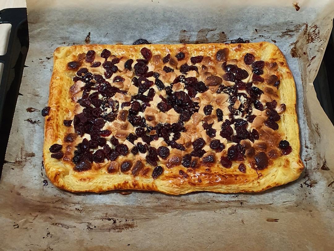 Puff pastry tarts – 1. Kashkaval, tomatoes and pesto. 2. Kashkaval and poppy seeds. 3. Apples (par-cooked in butter, vanilla sugar, cinnamon and a bit of left over strawberry jam) and caramel ice cream. 4. Dried cranberries soaked in orange juice and white chocolate.