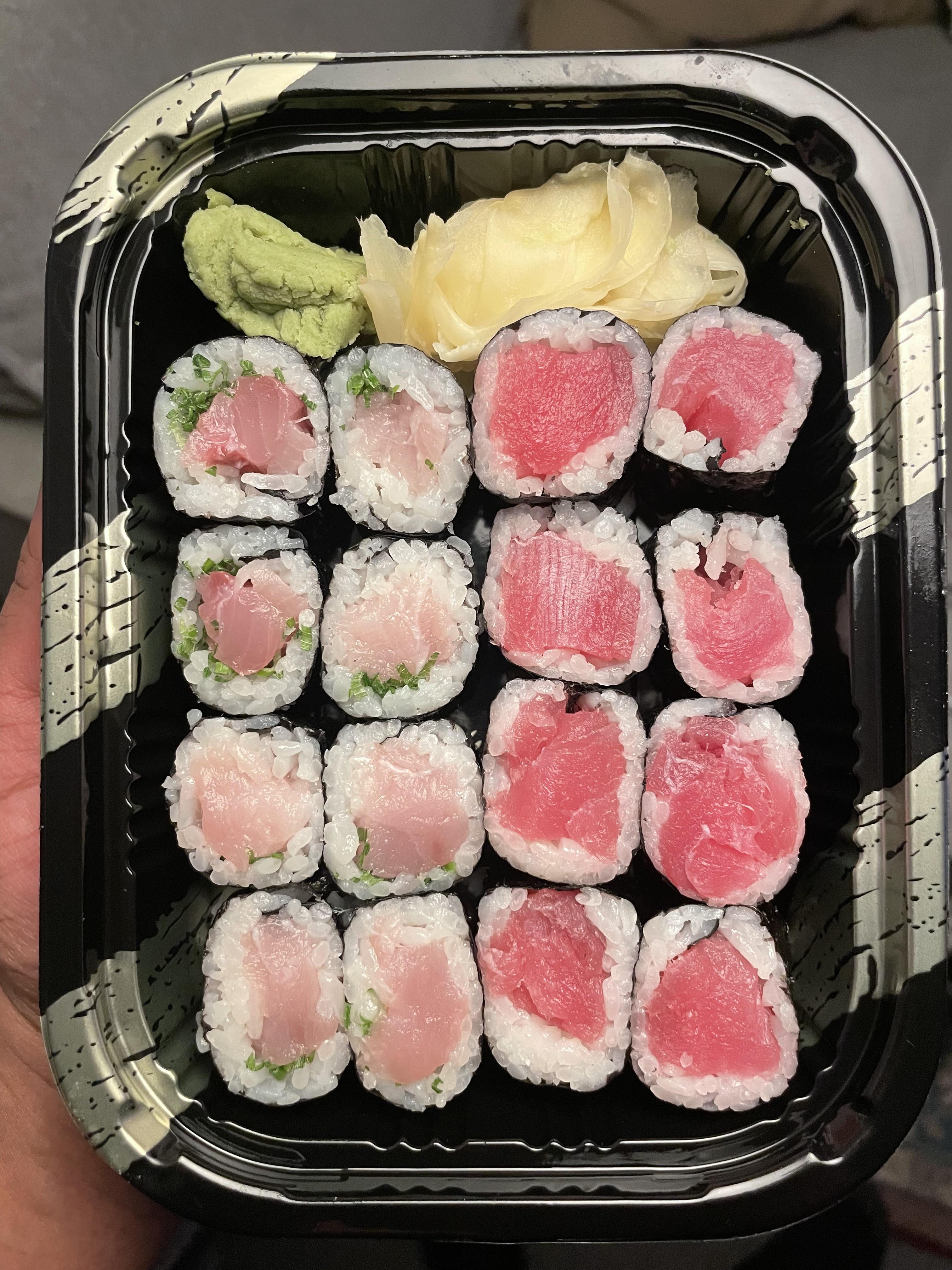 this looks incredible. hamachi is my favorite. tuna second. rice to fish ratio amazing… and the MAKI style. sheesh.