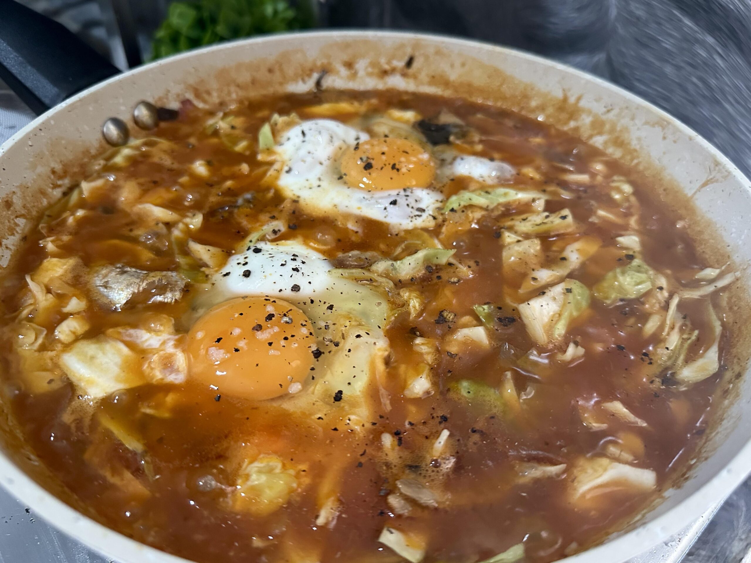 Canned tomato sardines with cabbage and eggs on top. Serve over rice. Cheap and easy to make. 🙂