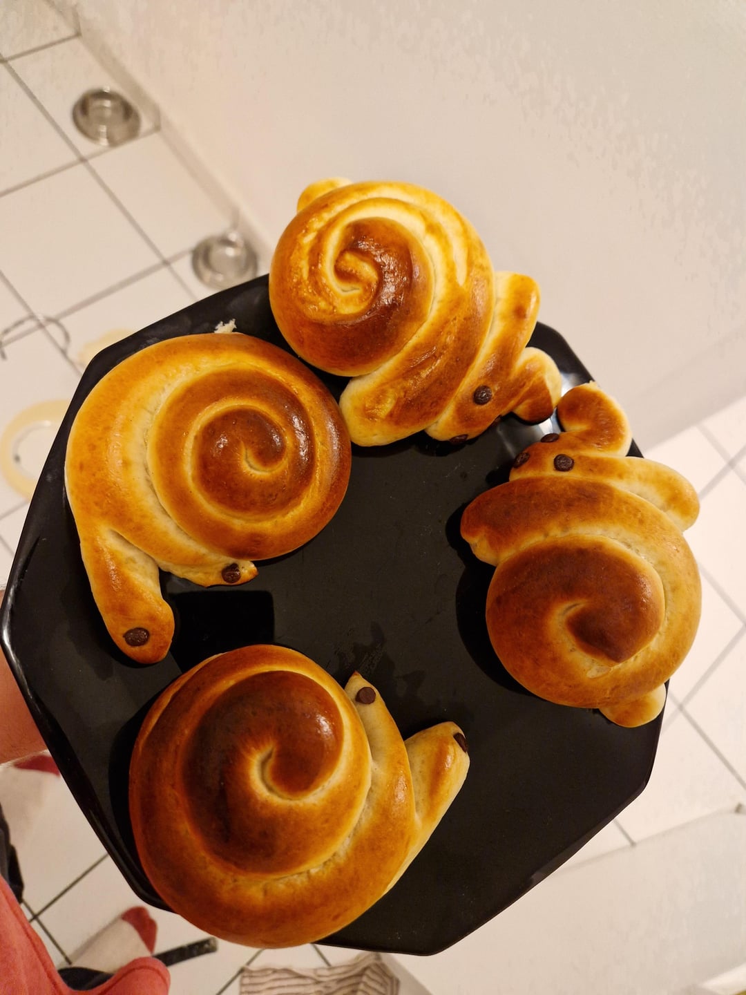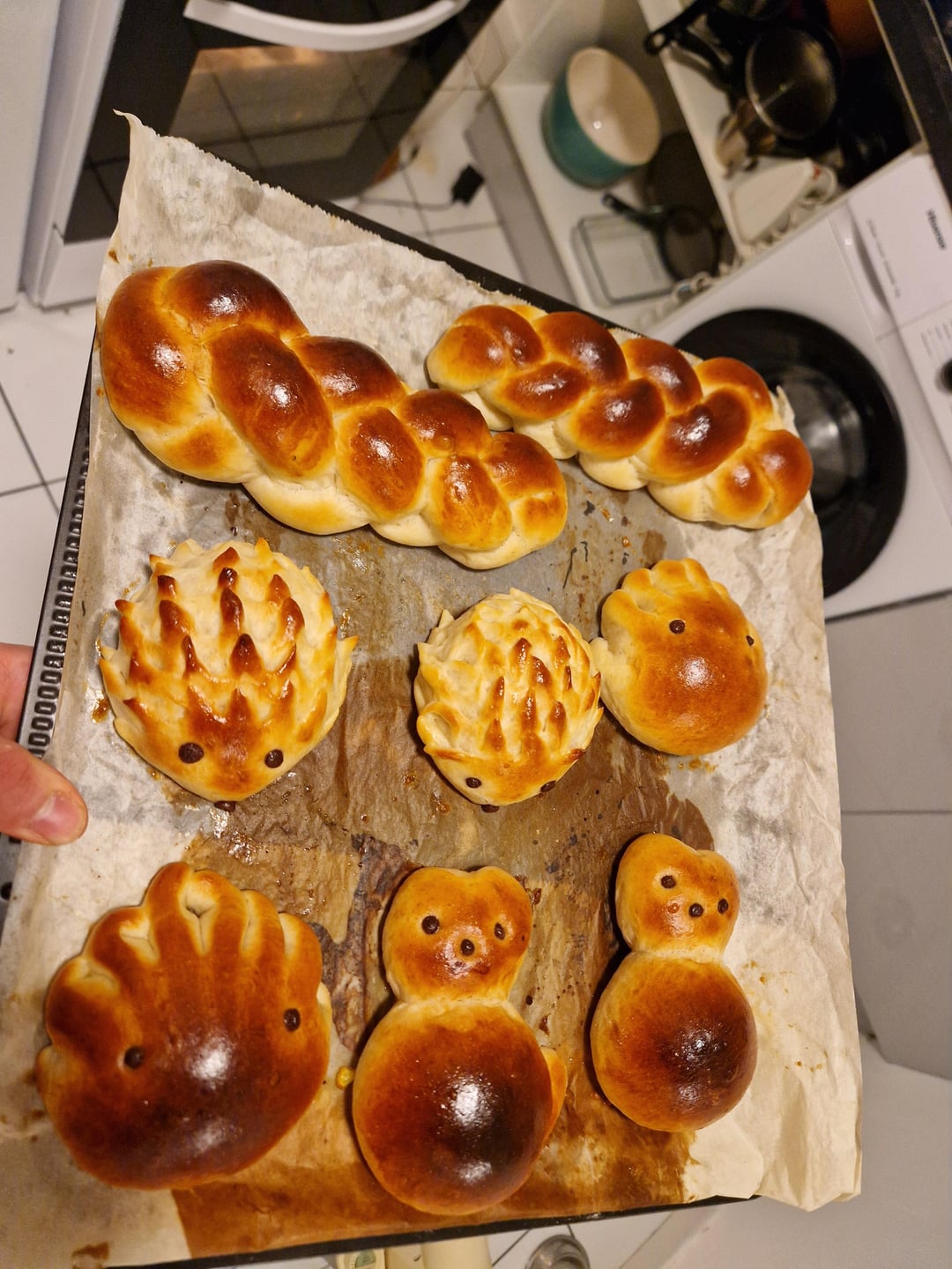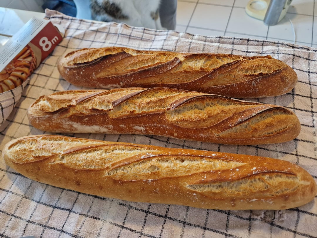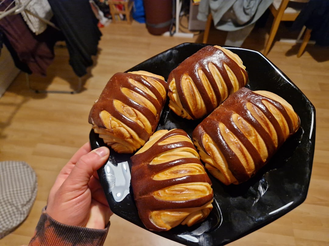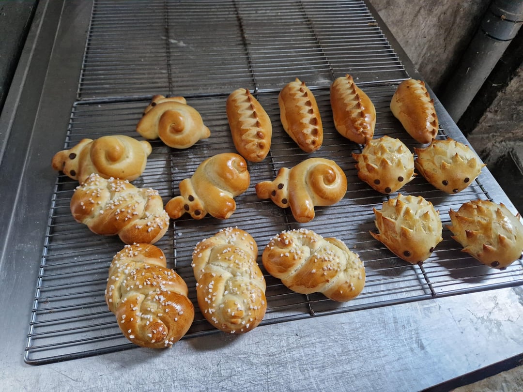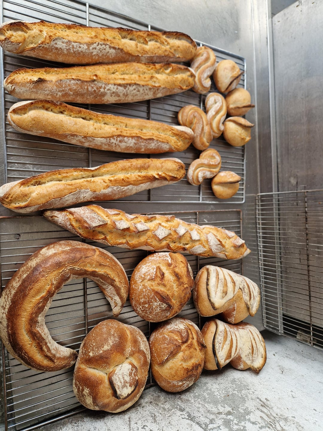 In order we have Croissants, Pain au Lait, a few breads in different shapes, Pain Brioché, and more bread, and finally an attempt at bi-coloured croissants and pains au chocolat