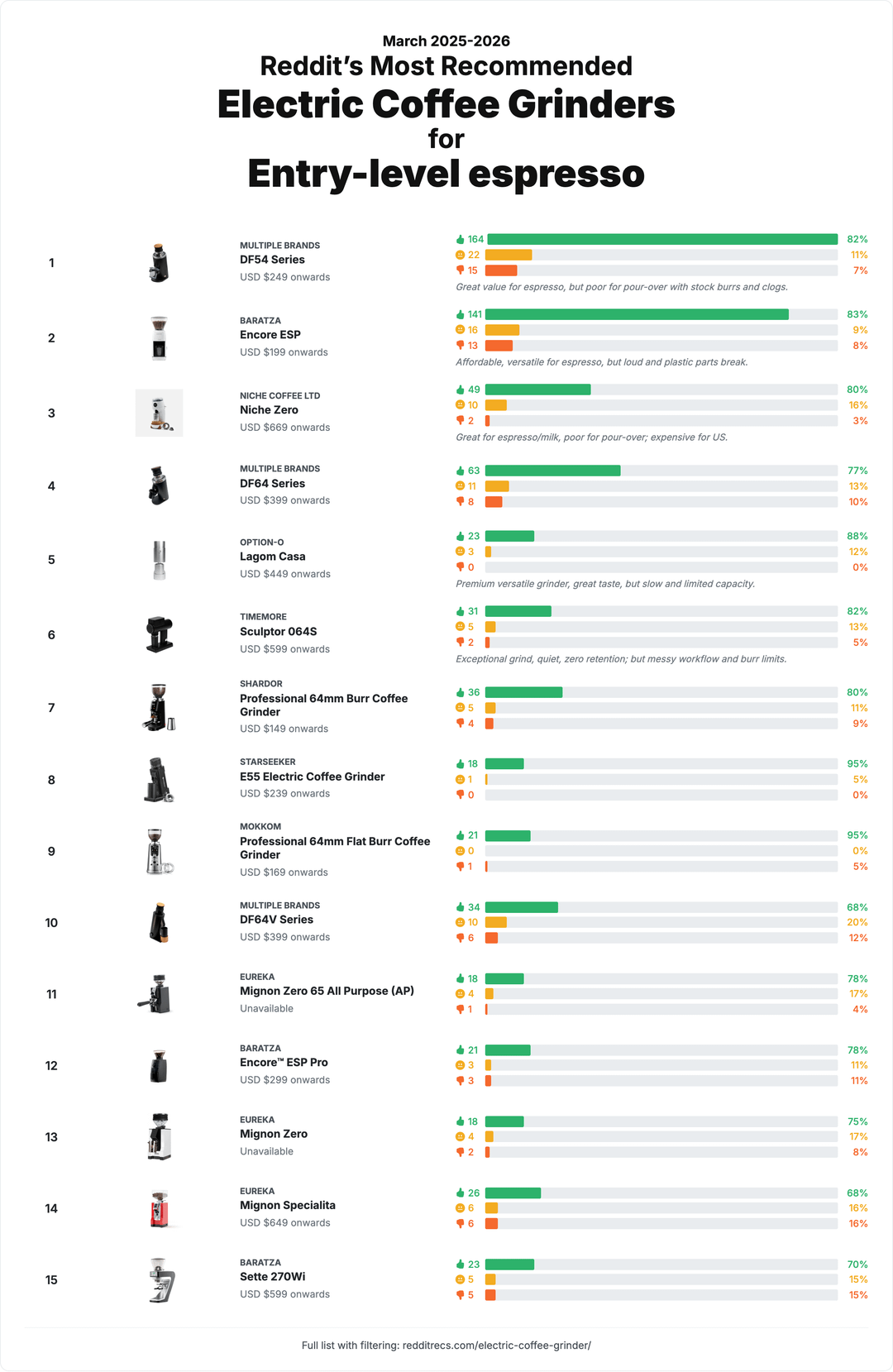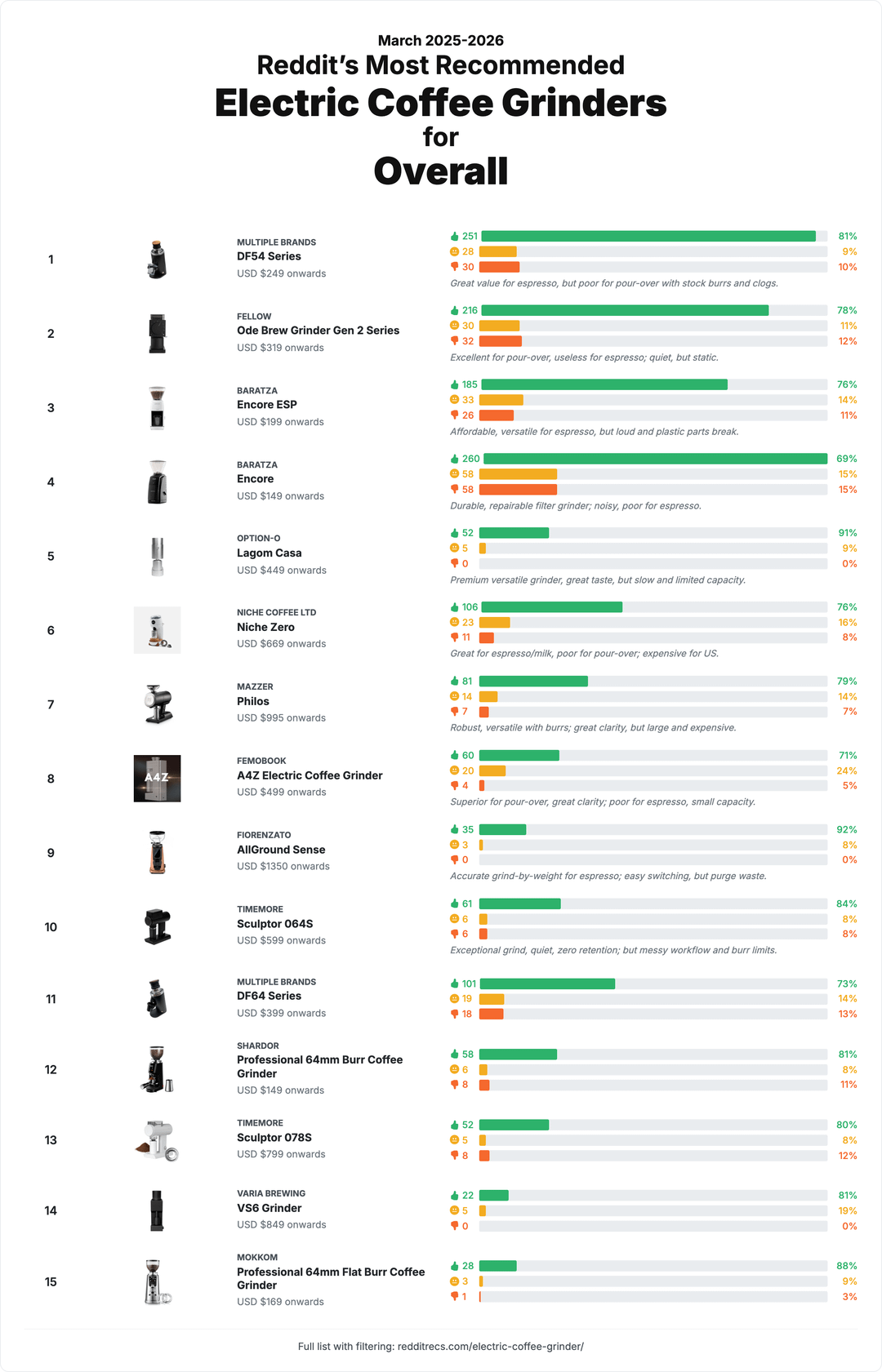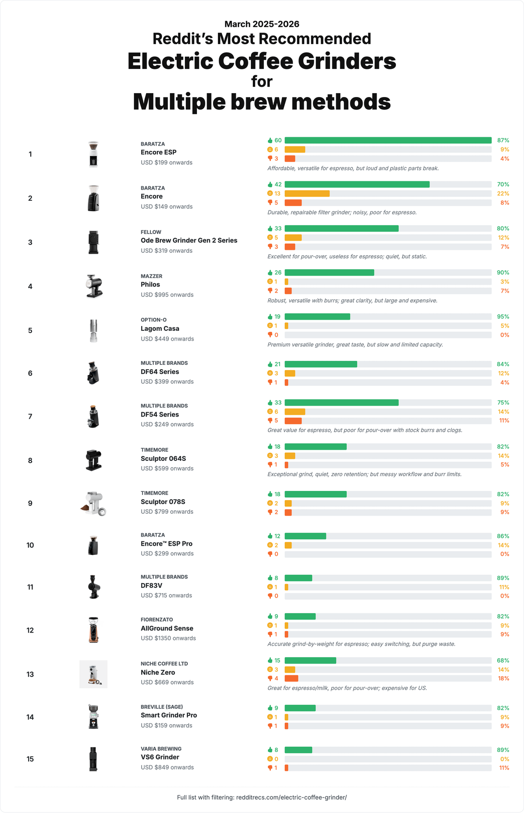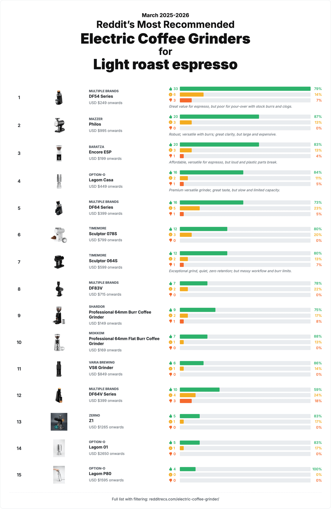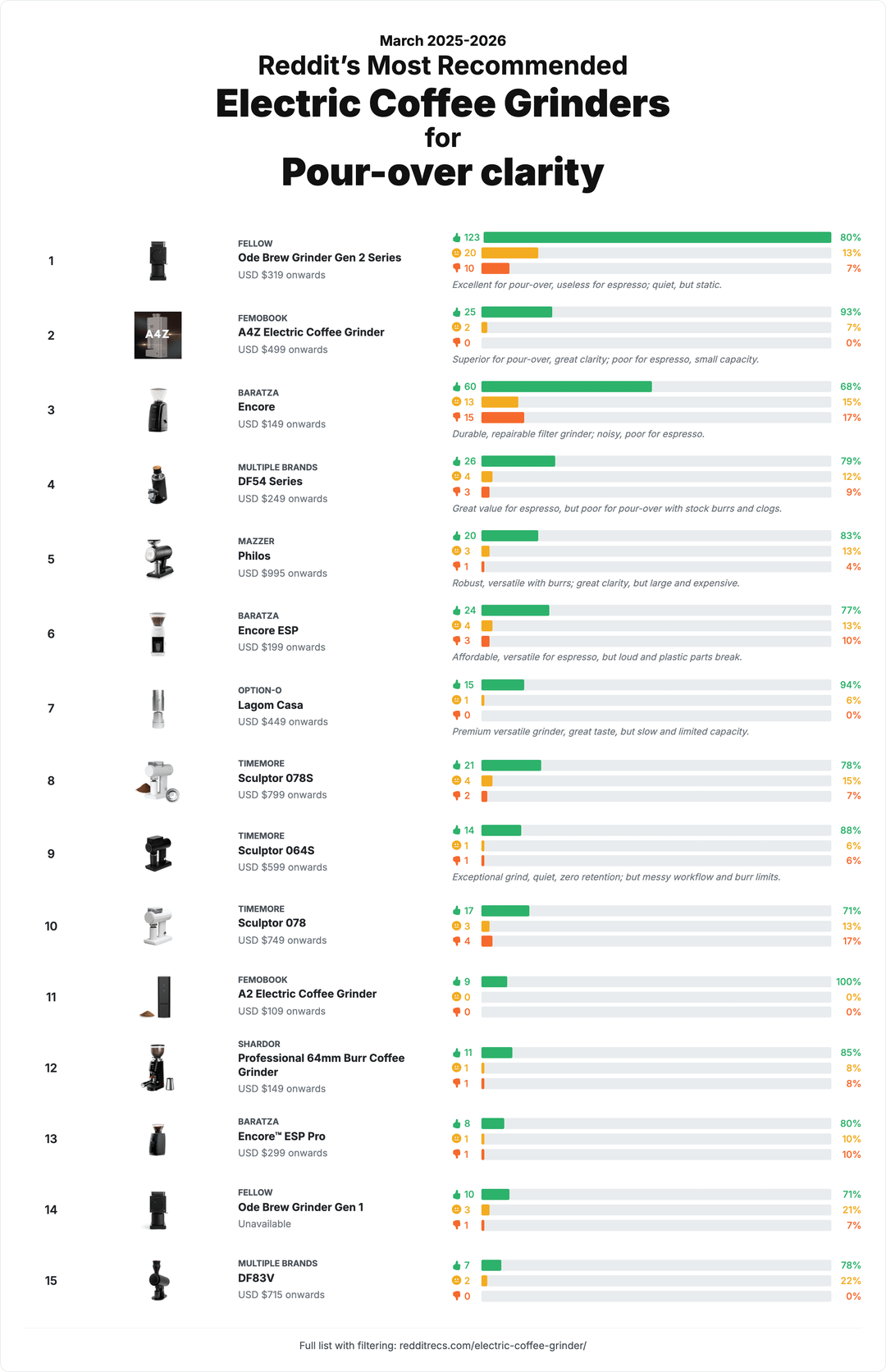Nice, but honestly the results look heavily biased towards what is common, available for a long time and affordable (most posts). E.g. a Baratza Encore really should not be at the top of a pour-over, light roast or multi purpose grinder list.