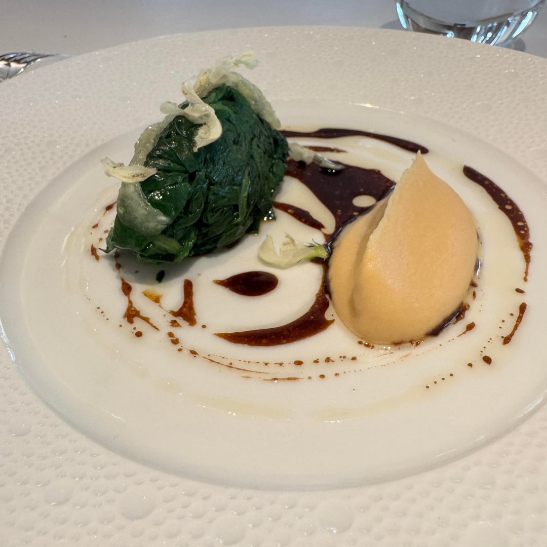 My favorite dish of the meal was something I probably would have been least excited about reading it on a menu: spinach, with Meyer lemon confit, a white beetroot purée, and a little sesame oil. I don’t really know how to explain why it was so good. It just was. Everything about it worked. Somewhere around this point in the meal, I realized I wasn’t missing meat at all.
