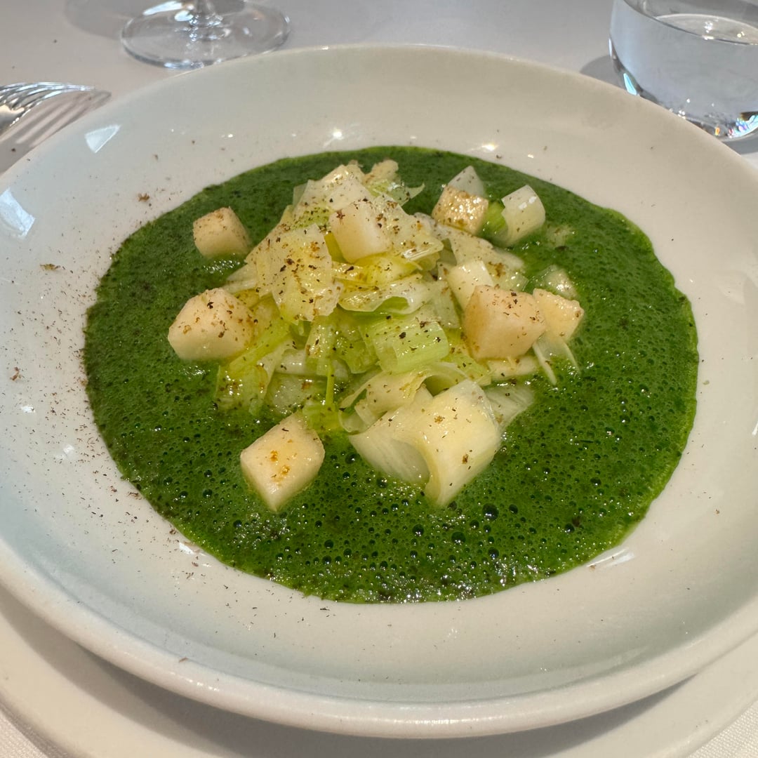 The first proper dish was a soup made from turnip greens with a beetroot mousseline and some mint oil. Pretty quickly you start to notice the through line of the whole meal, which is just how balanced everything is. Nothing is aggressive, nothing is overdone, everything feels just so.