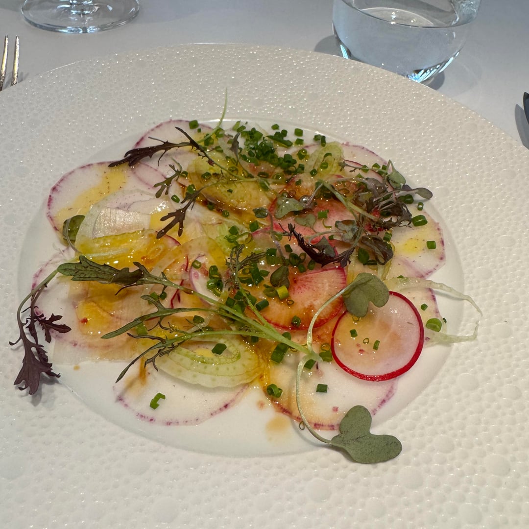 One of the next dishes was a radish carpaccio with ponzu. On paper, that sounds almost too simple to be interesting, but it was honestly perfect, really clean, really bright, and extremely satisfying.