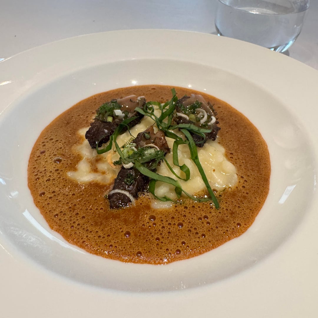 Then there was a dish with leeks that were cooked but still had a bit of bite and crunch to them, paired with pear and a broth made from cress and licorice. I mentioned to one of the servers that the pear worked really well in the dish, and she went into detail about how these were the last pears of the season, and that they had a bit more sun than usual, so they were higher in fructose. That level of detail and specificity about the produce was really impressive.