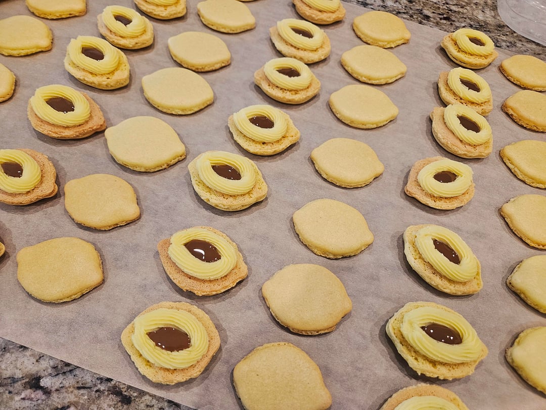 Components – Banana butter cream outer filing (butter, powdered sugar, banana pudding mix, vanilla, salt, splash milk) and dulce de leche middle