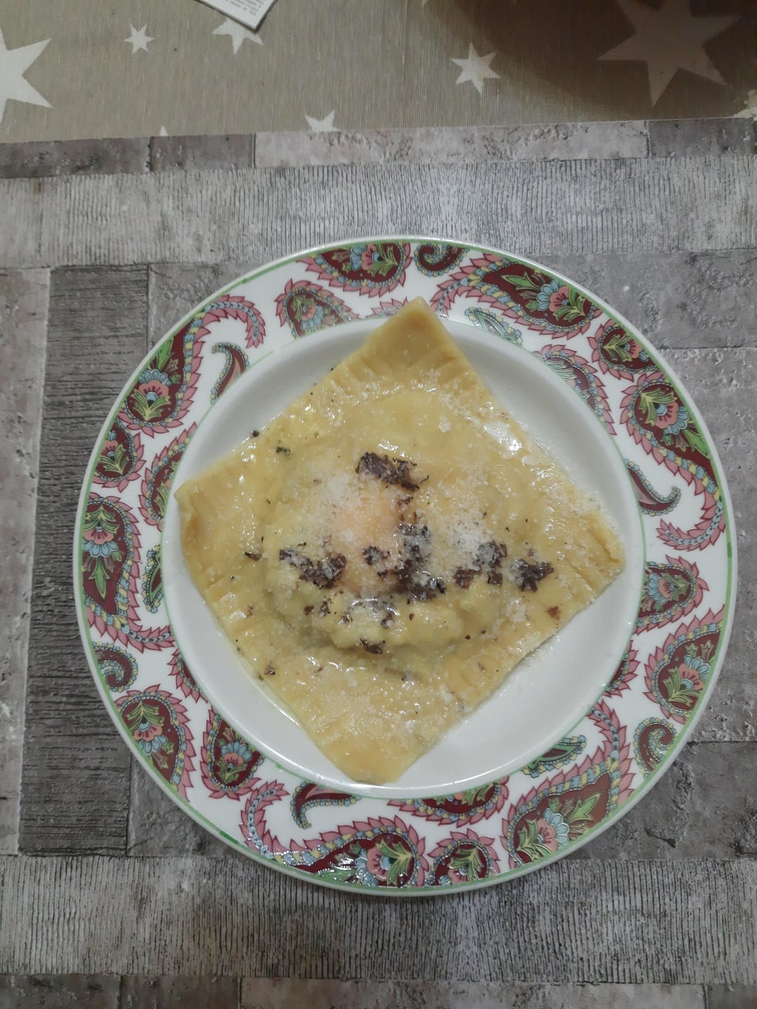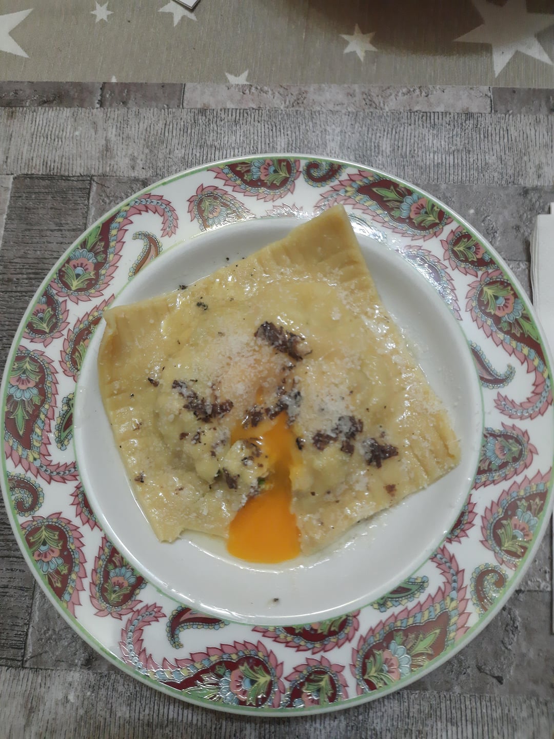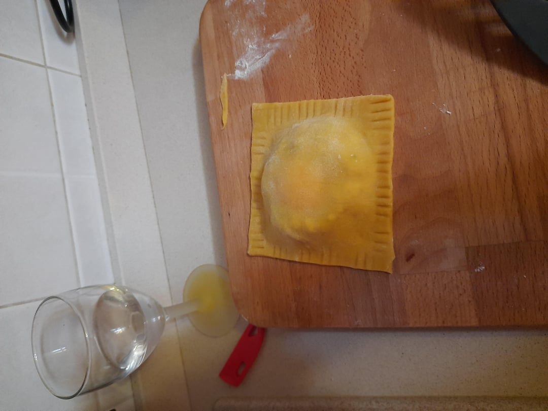 Giant raviolo with "raw" egg yolk and truffle butter. The filling is made with ricotta ad a mushroom duxelle (and a yolk).