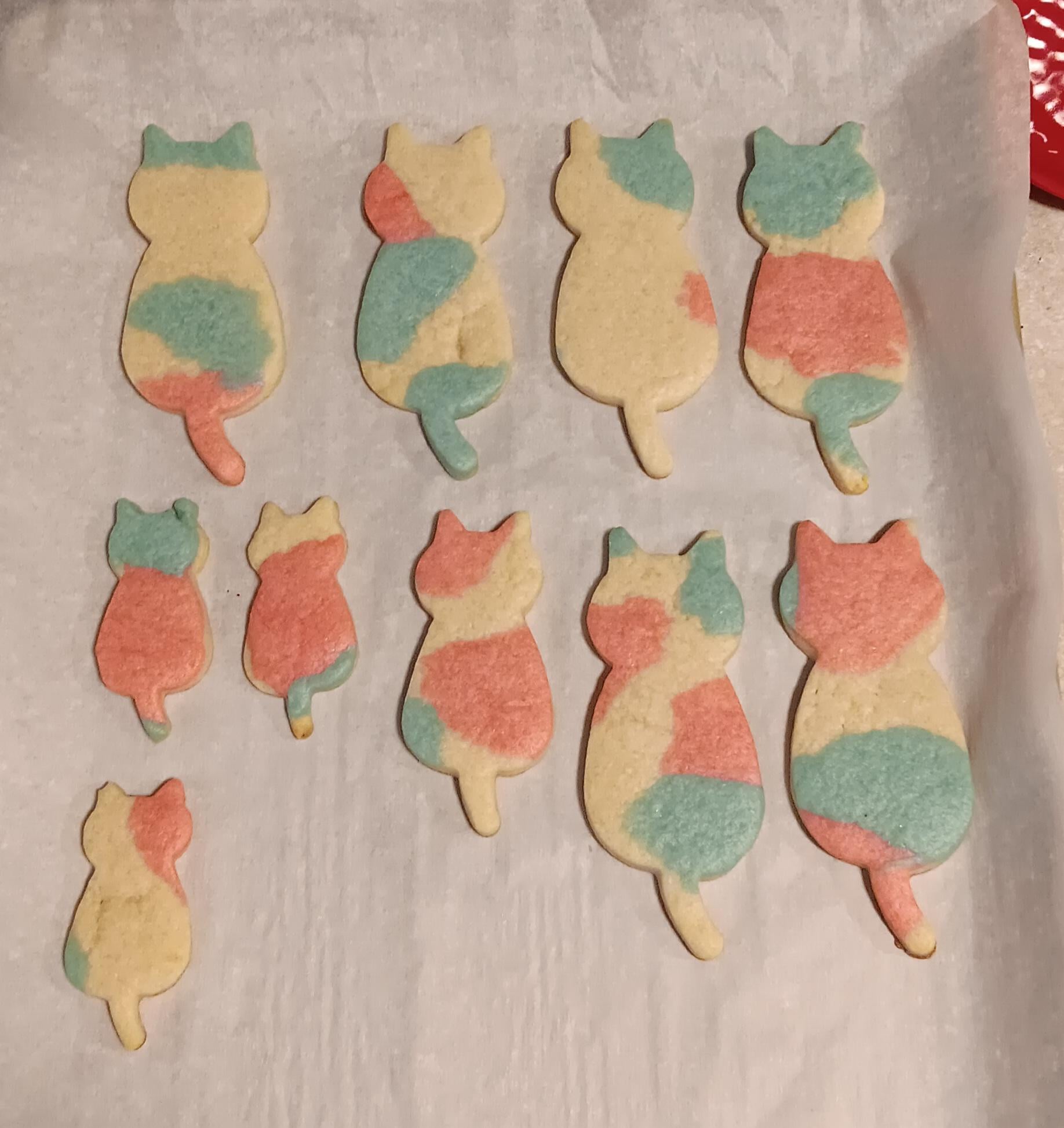 I made trans pride calico cat cookies for my.roommate! I used the Sally's baking addiction sugar cookie recipe for these. Instead of vanilla I used strawberry extract! These were fun and so easy to make!