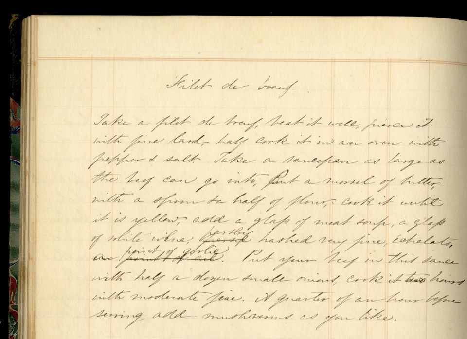 At first glance, Fanny Longfellow’s filet de boeuf recipe seems simple and straightforward. However, if taken at face value, the modern cook will end up with the wrong cut of meat, baked until it turns to leather in an oven for two hours! To adapt the recipe, we turned to the talented Julia Child, who spent years translating old French recipes for current cooking techniques.