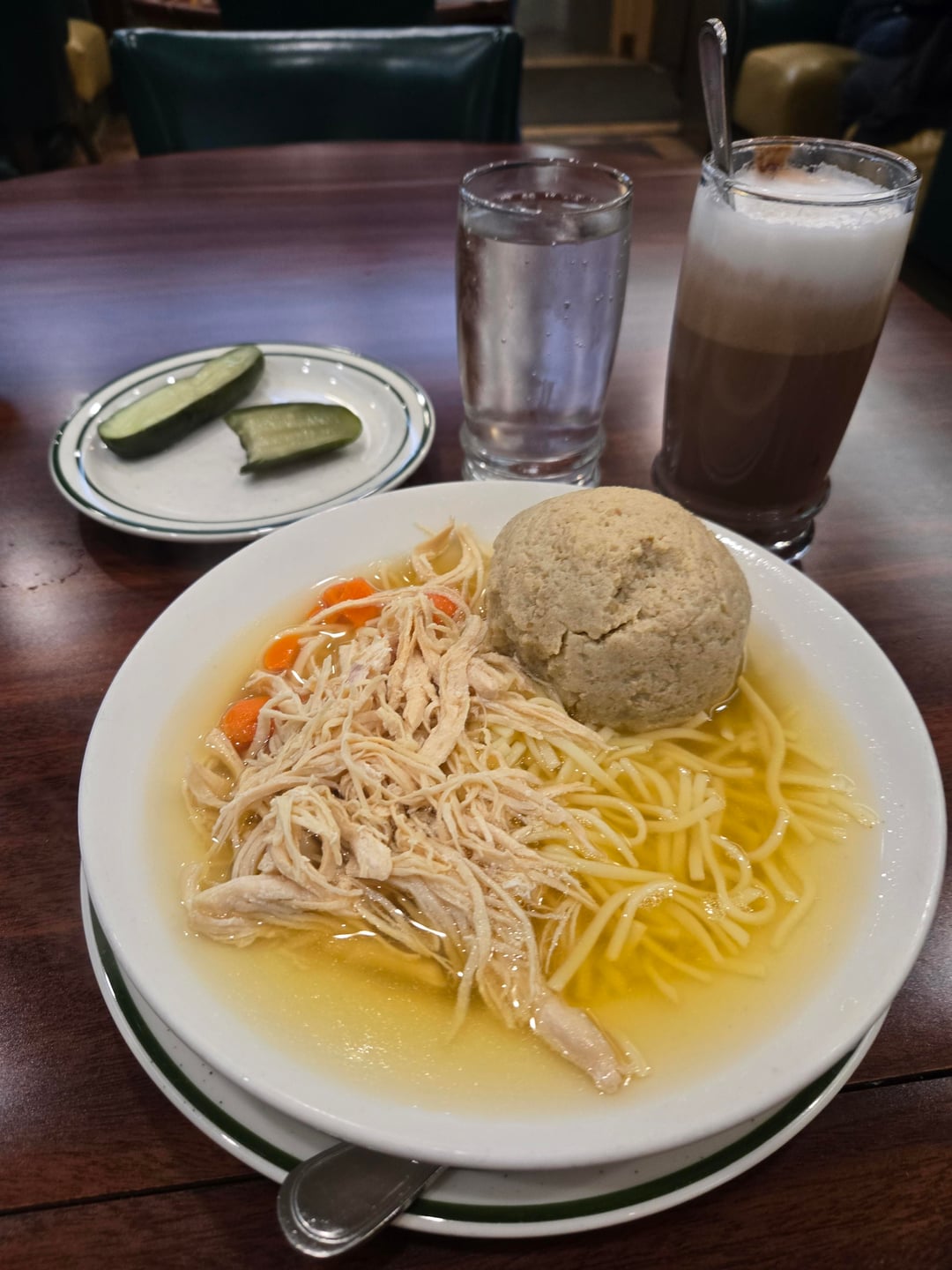 went in to Brent's yesterday, got the soup/sandwich combo with matzoh ball and corned beef. Now I have had good meals at Brent's, and I know they're widely beloved here. but what's the deal with the matzoh ball soup? the soup tastes like it comes from a can – the broth tastes very lightly of salt and not much else, the chicken is tough, and the noodles so soft they sort of mush in your mouth. the matzoh ball is of the mushy kind – not my favorite, but it's a legitimate style. I'm just kind of surprised how lackluster it was given how much praise I see for brents and for this soup in particular. granted I haven't had many truly great matzoh balls at LA restaurants, but even Canter's has a matzoh ball that makes this one look like a school cafeteria lunch.