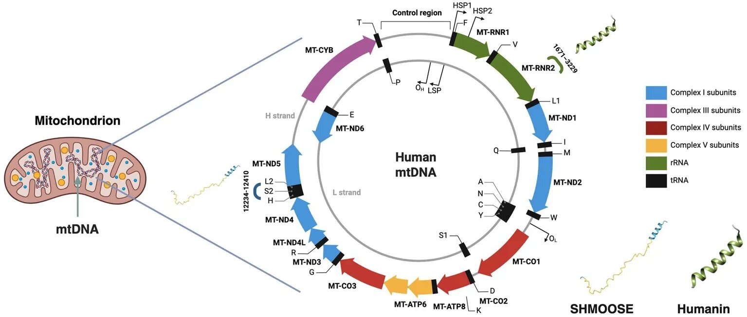Localization of SHMOOSE and Humanin within the human mitochondrial genome. Schematic representation of the human mitochondrial DNA (mtDNA). The outer circle represents the H-strand, containing most of the mitochondrial genes; the inner circle represents the L-strand. Humanin is encoded within the MT-RNR2 gene (16S rRNA) between nucleotides 1,671 and 3,229, and SHMOOSE is encoded by a small open reading frame (smORF) overlapping the serine tRNA region, between nucleotides 12,234 and 12,410. The 3D structures of Humanin and SHMOOSE, predicted with AlphaFold 3, are shown. Created in BioRender. Credit: Frontiers in Nutrition (2026). DOI: 10.3389/fnut.2025.1727012