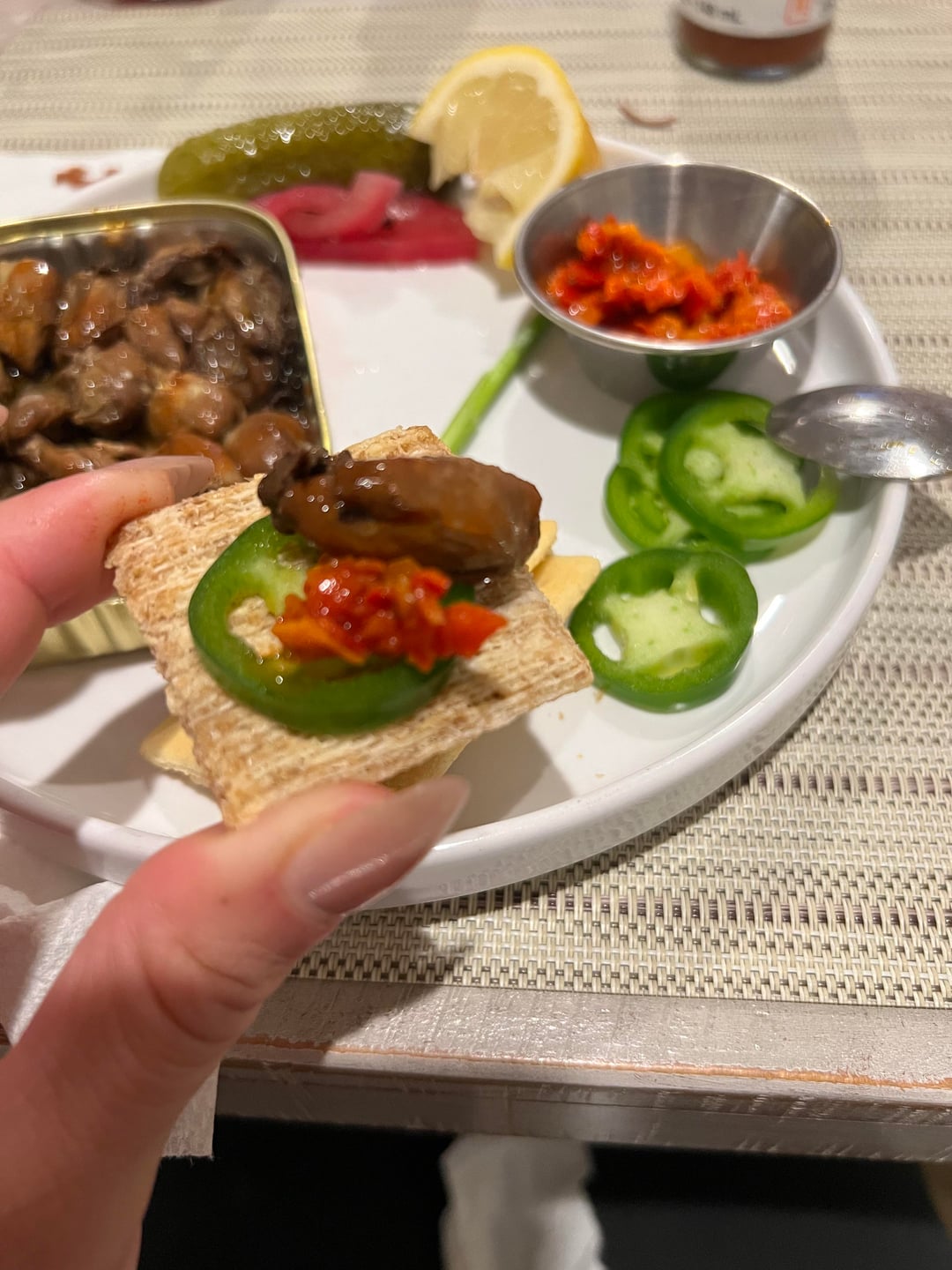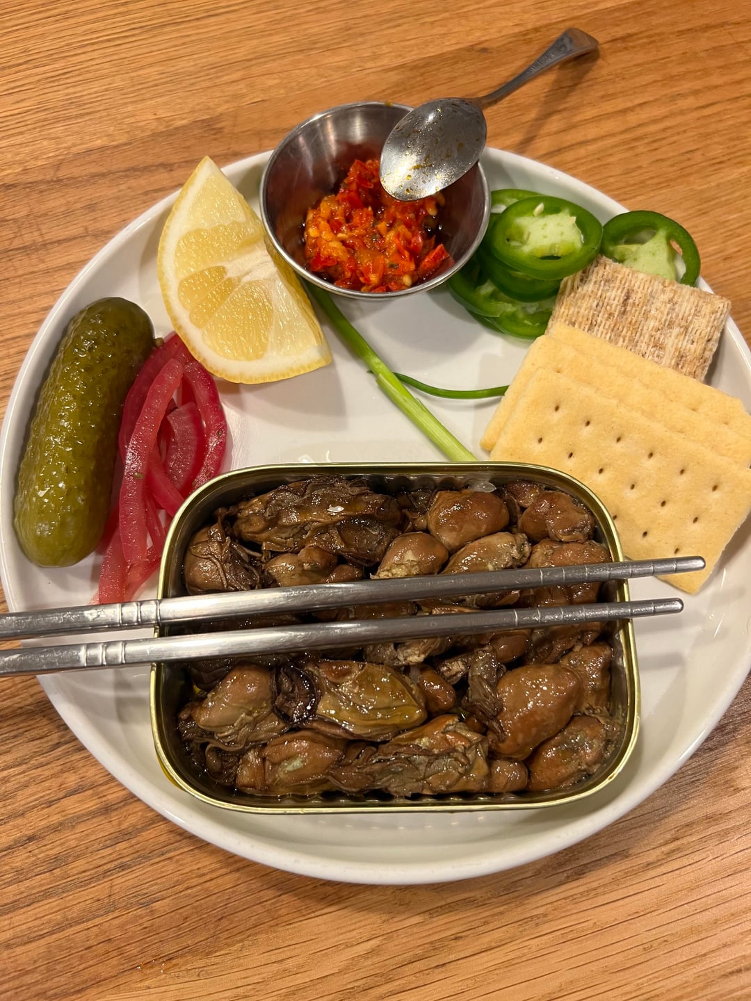 Napoleon Smoked Tiny Oysters with a spicy influence. Flaming hot ruffles, Triscuits, and club crackers as optional bases. Pickled red onions, spicy pickles, Calabrian chili , jalapeño and green onions as toppers. Finish it off with Lemon, Tabasco and/orz Tapatio. I always drain the oil and add lemon & hot sauce into tin.