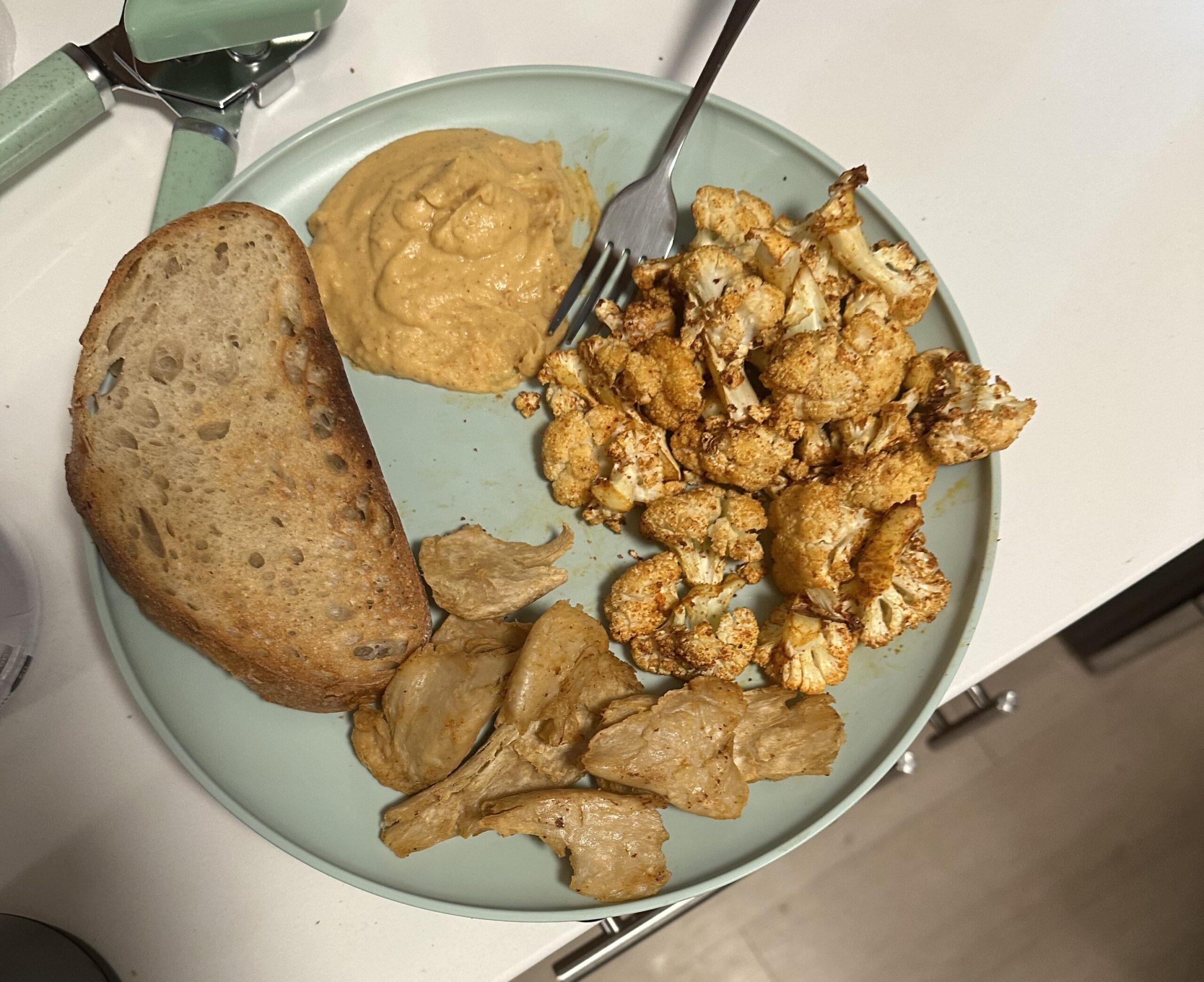 cut a head of cauliflower into florets, season to taste (i used paprika, garlic powder, onion powder, chili powder, cumin, msg, and salt). Toss in about a tablespoon of oil and air fry on 375 for 15 minutes, flipping halfway.