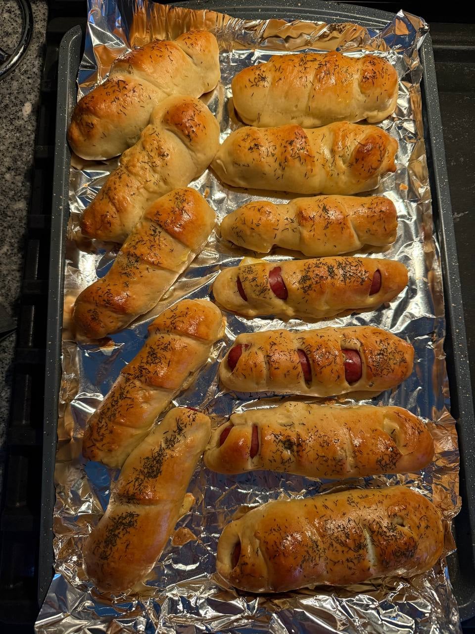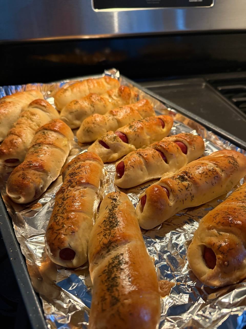 My mom used to wrap hot dogs in the Pillsbury crescent roll dough (the kind that comes in a tube) and bake them. We called them “pigs in a blanket” although I know a lot of people consider those to be only sausages wrapped in pancakes.