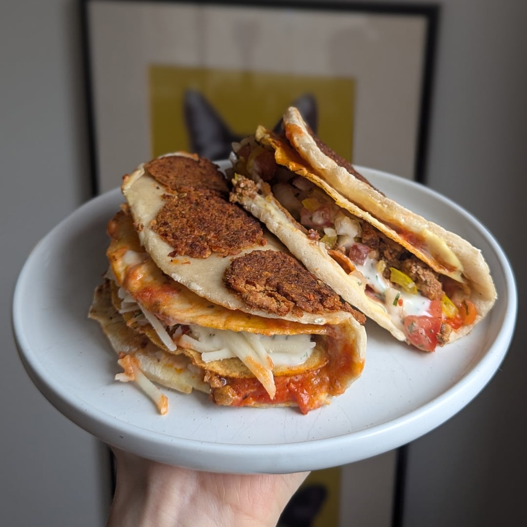 For April Fool’s I wanted to make some stupid ass meal to piss off the Italians and confuse the Taco Bellians, so I … did that. Homemade pepperoni-infused flatbread slathered with homemade mozarella and Rao’s arrabiata pizza sauce + a crispy corn tortilla filled with homemade sweet and spicy sausage, homemade ranch, homemade pizza de gallo, and shredded mozzarella. Recipe’ll be posted Monday!