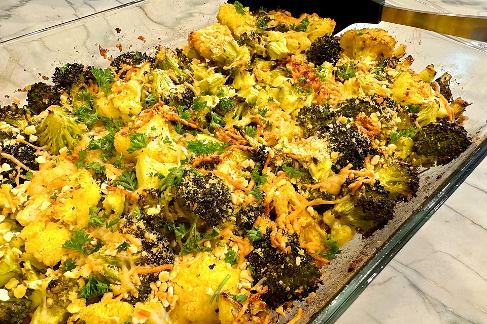 Serve this crispy roasted broccoli and cauliflower casserole recipe as a savory