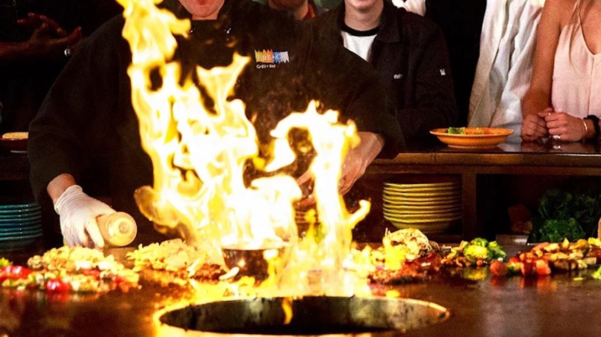 A chef prepares food on a fiery hibachi grill while customers watch – fireandiceboston/Instagram
