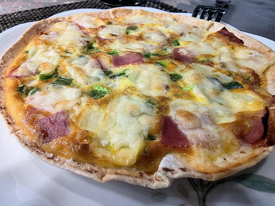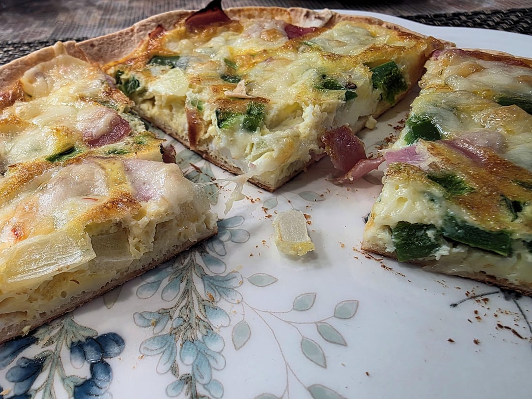 Soft flour tortilla, 3 eggs whipped, diced onion, jalapeno, poblano, some ham, a bit of salt & pepper, topped with pepper jack. Slow heat in skillet until soft set, finish in air fryer.