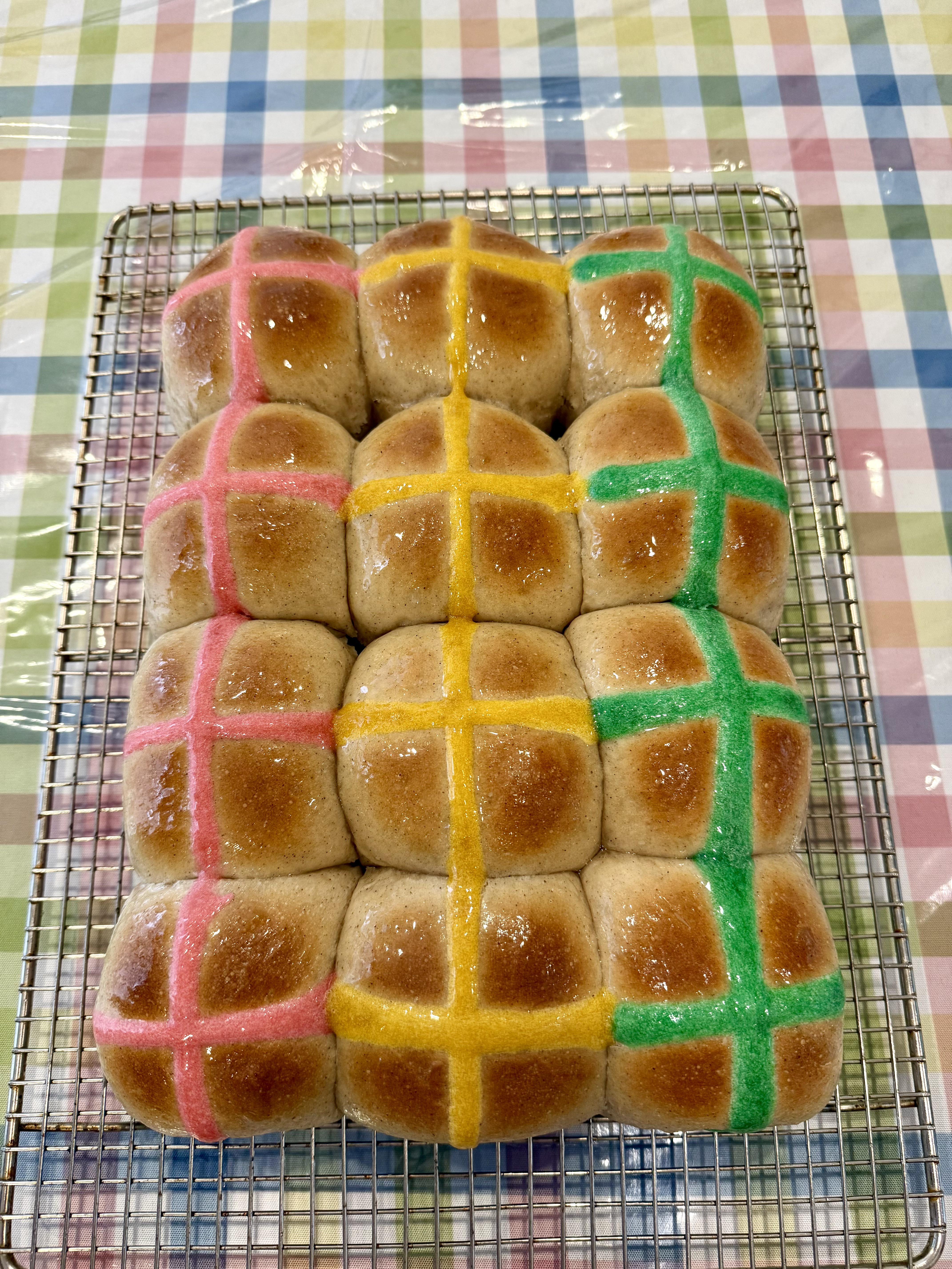 A few days ago I made hot cross buns with chocolate chips. My kids requested another batch with no fruit or chocolate and Easter colored crosses. I complied πŸ˜‚ Happy Easter! 🌸🌷🐣. Recipe in comments.
