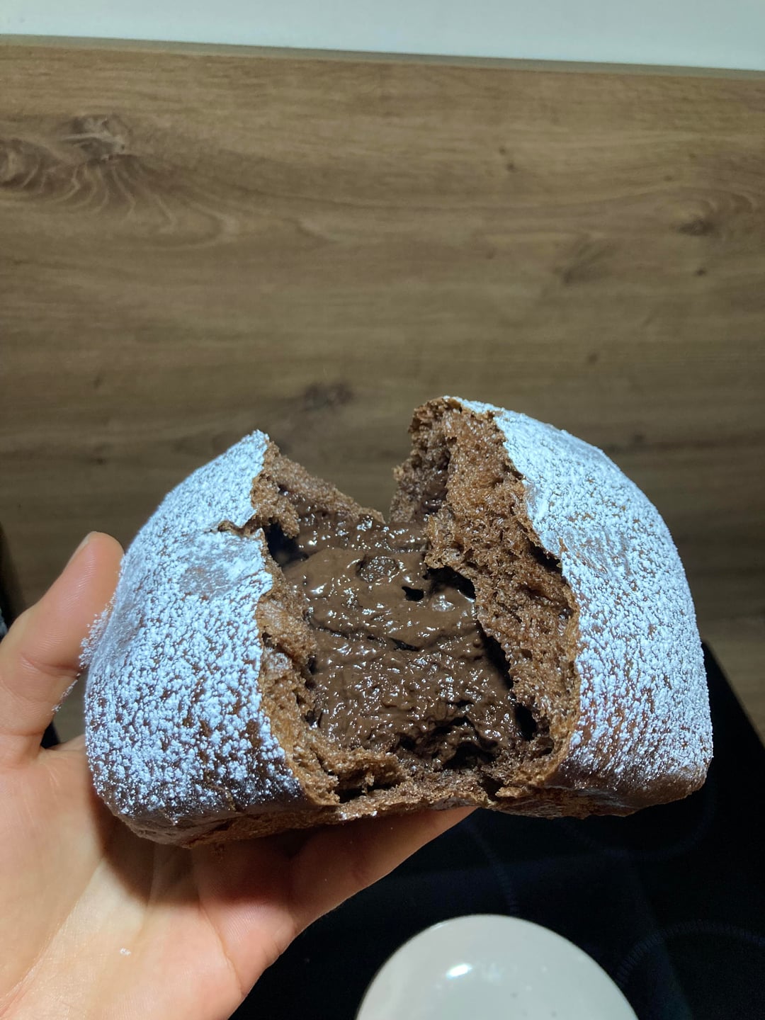 It’s a chocolate brioche stuffed with a frozen chocolate ganache puck. I was aiming for a liquid chocolate filling (like the one in the video) but mine was custardy after baking, which is weird considering I used the same ingredients and ratios. I will try reducing cornstarch next time.