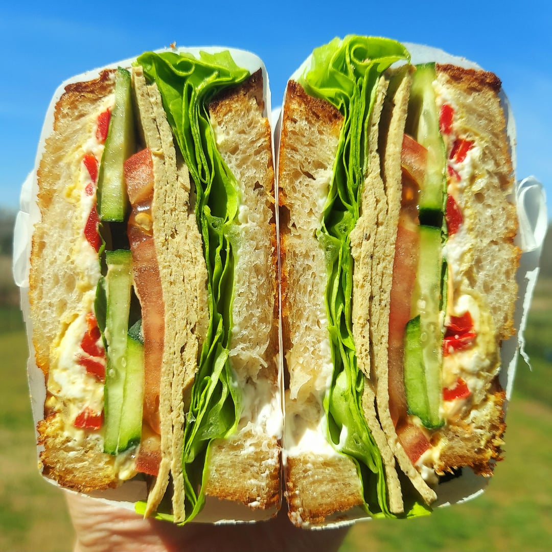 Smoky baba ghannouj, arugula and baby cucumbers, red chimichurri beef, sliced shallots, cashew cream, and Peruvian teardrop peppers on grilled sourdough.