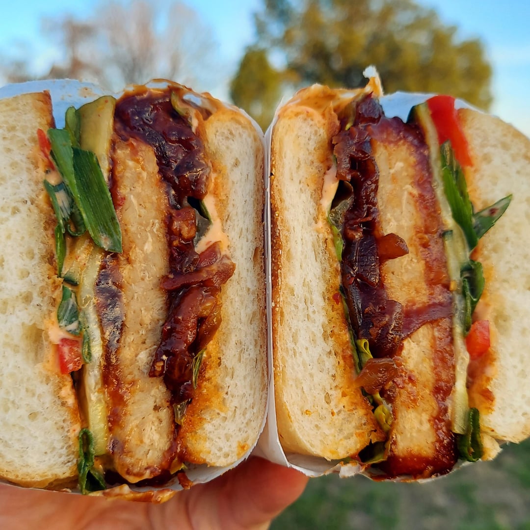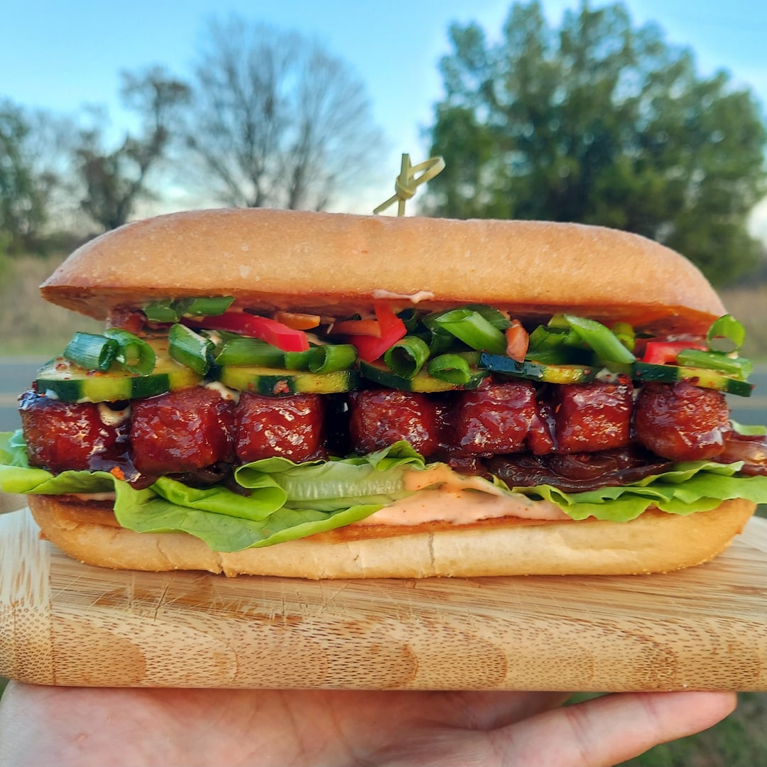 Glazed plant-based riblets on a toasted hoagie roll with sriracha mayo, butter lettuce, kimchi caramelized onions, cashew cream, oi muchim, green onions, and julienned peppers.