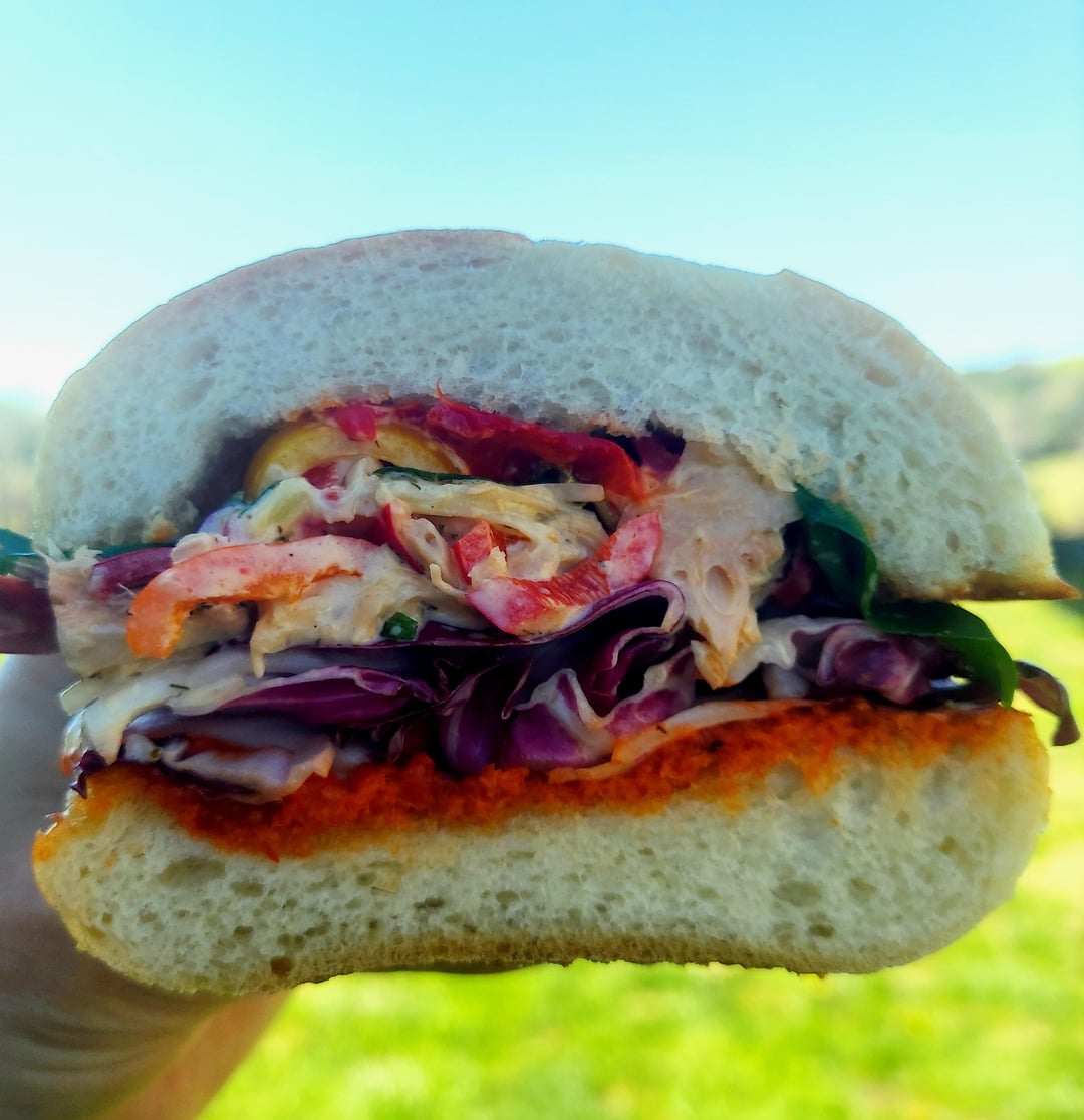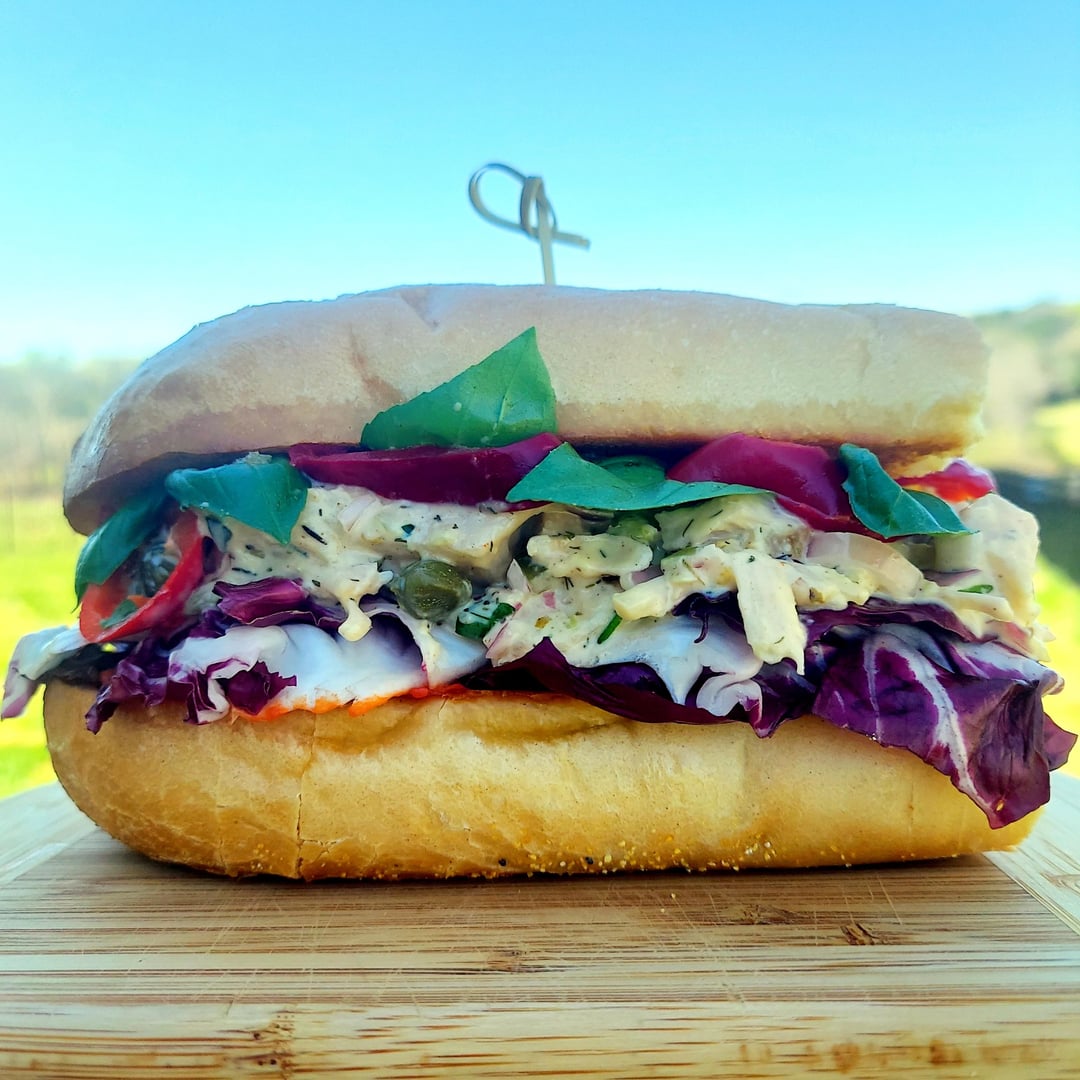 Jackfruit tuna salad layered over radicchio and Ajvar, Fresno and Calabrian chilis, and baby basil leaves on butter-toasted French bread