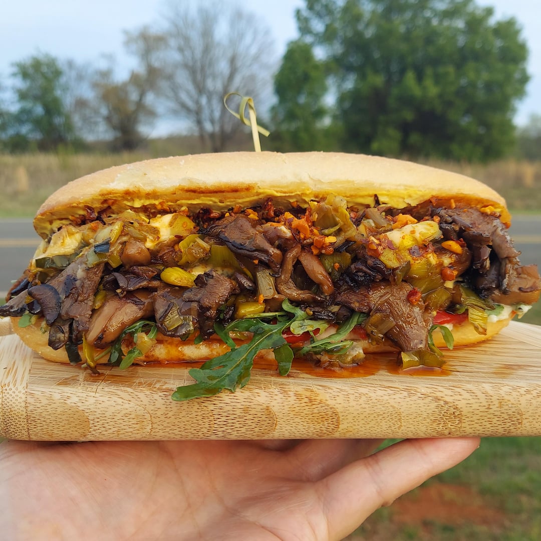 Caramelized oyster mushrooms and leeks with boursin, FYH gouda, arugula, piquillo peppers, and spicy mustard finished with Tin Man Oils Carolina chili crisp