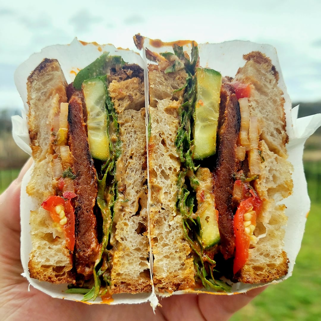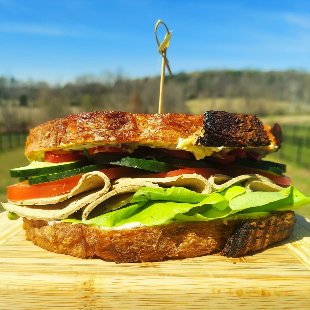 Unreal turkey, tomato slices with smoked sea salt, cucumber, Fresno chilis, baby basil leaves, butter lettuce, mayo, Violife French onion spread, and green peppercorn mustard on grilled sourdough