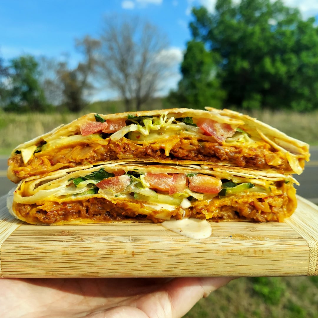 Kimchi crunchwrap with seasoned Beyond meat, kimchi queso, grilled kimchi, cashew cream, oi muchim, diced tomatoes, iceberg lettuce, cilantro, and green onions