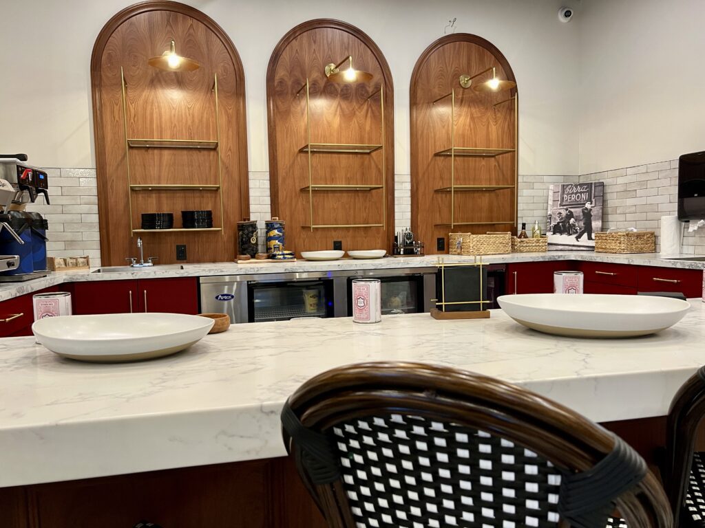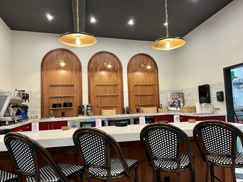 While Mozz & Co won’t be the type of traditional Italian deli with slabs of meat hanging from the ceiling, it will feature house-crafted meats as well imported salamis and cheeses and homemade Italian desserts. The interior of the new fast casual eatery was transformed from its previous occupancy as a casual Mexican restaurant by designer Robin Jones into a space where guests can gather and linger over a sandwich and espresso just as easily as they can grab lunch or dinner to go.