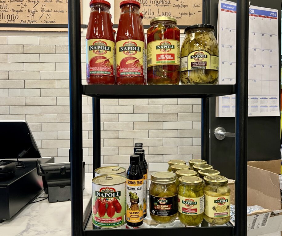 “A sandwich is all about the bread,” Monica Cusano said. The outside needs to be crispy but not too crispy, and the inside needs to be soft and properly hold the meat, but not too bready. She said that over the course of a month or so, she and Joey tested out bread from eight or ten bakeries until they found the “just-right” option of A&M. Rockland Bakery is the back-up, and will be the source of rolls and baguettes that will be available on the retail shelf along with jars of marinated artichokes, pepperoncini, and other Italian specialties, as well as Mozz & Co merchandise.