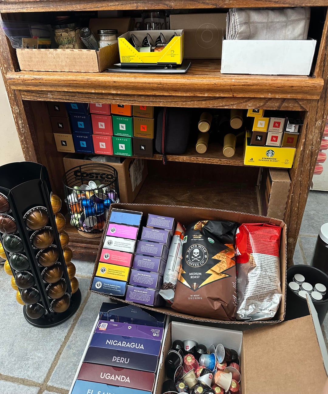 I started running out of room in my coffee bar storage so I DIY pod holders to use the available space on the sides. Then moved extra pods into a closet. I have two orders of the sample boxes (96 extra pods) from Woot coming and still I canāt stop buying these delicious beans. Help!