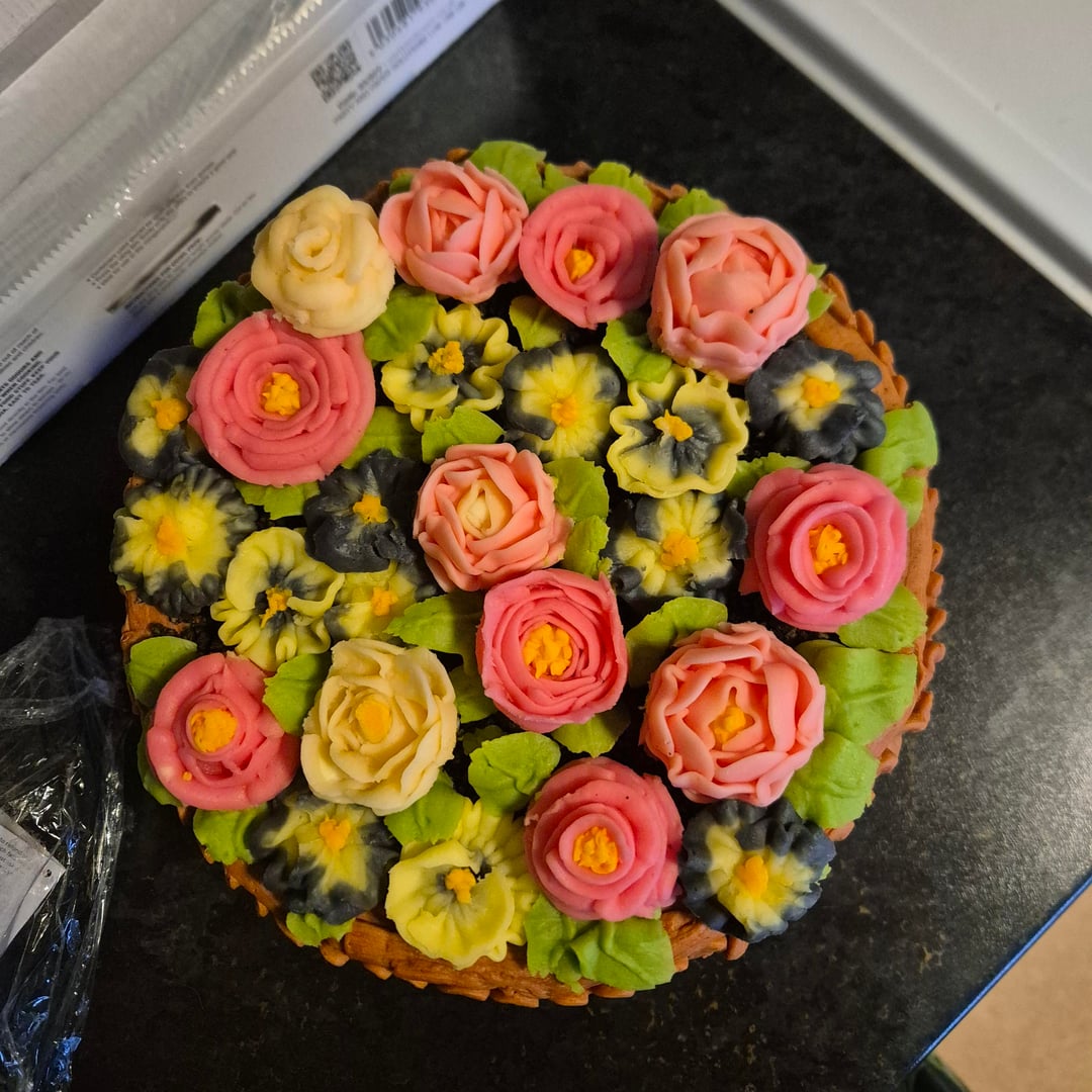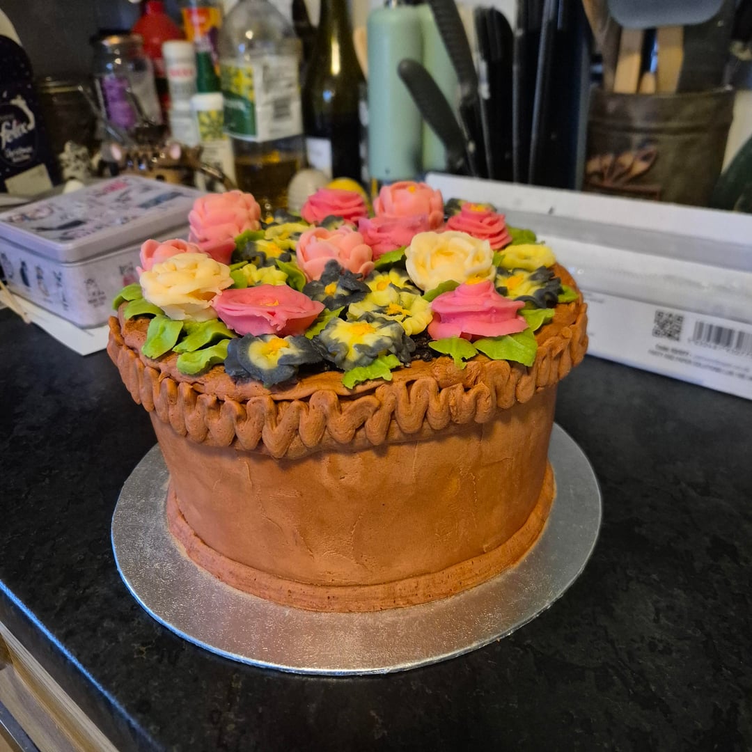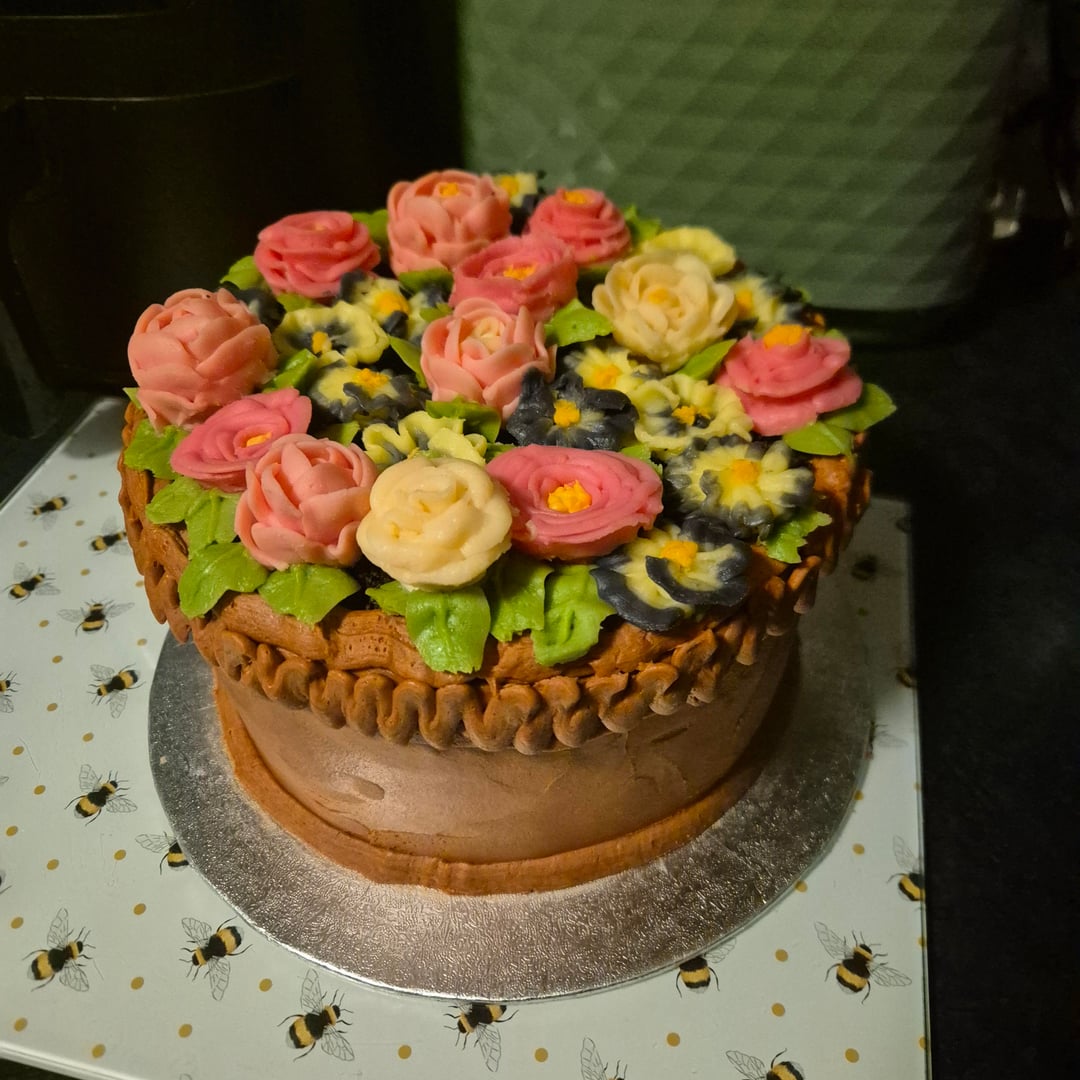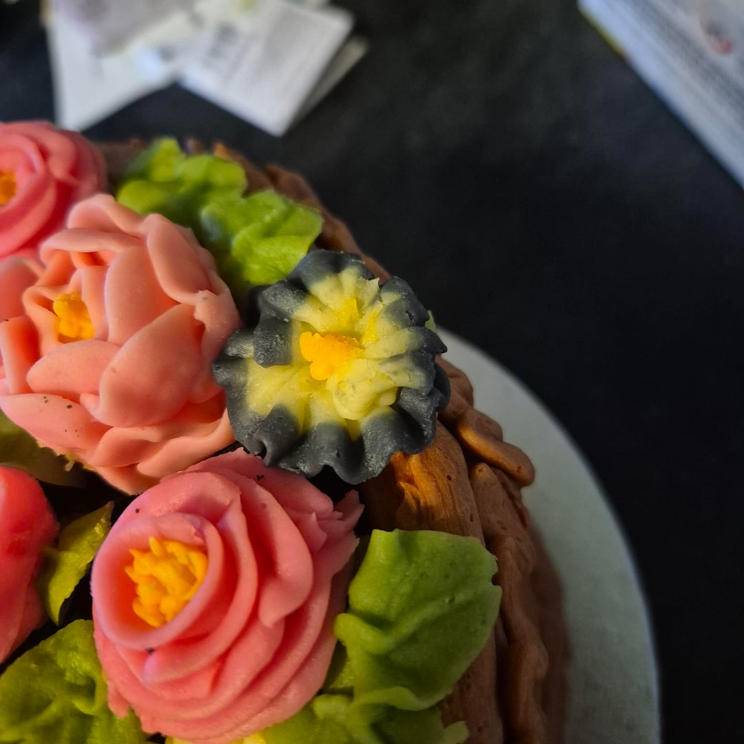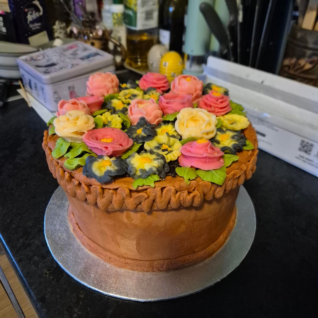 This might be the best cake ive made so far, chocolate sponges, vanilla buttercream on the bottom layer and blackberry jam on the top layer, with a mix of chocolate and vanilla buttercream for the outside and vanilla for the flowers! And blended oreos for the ‘soil’ under the flowers
