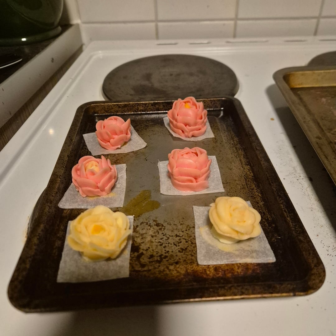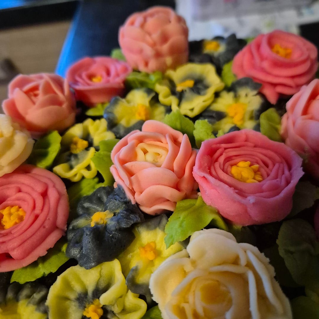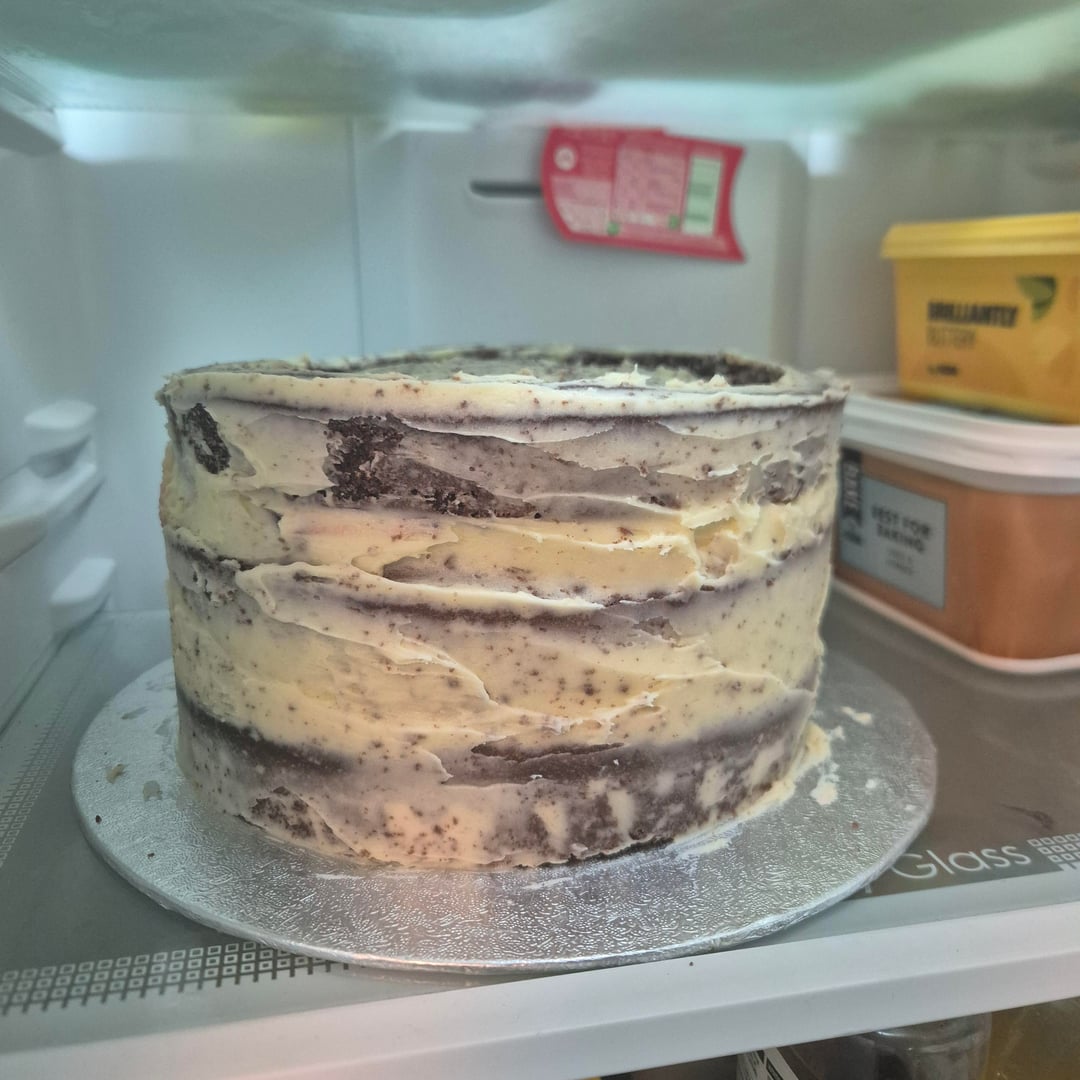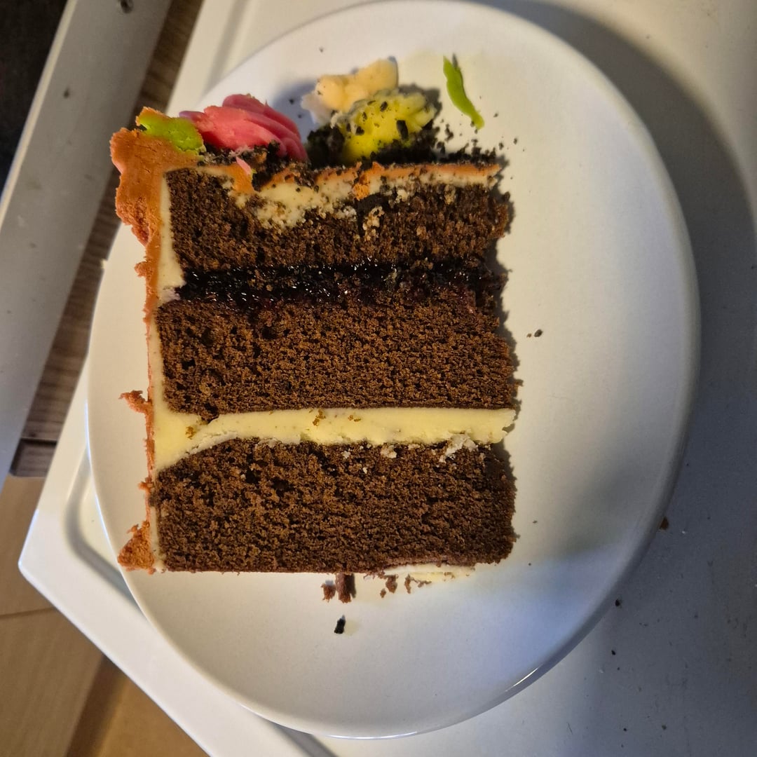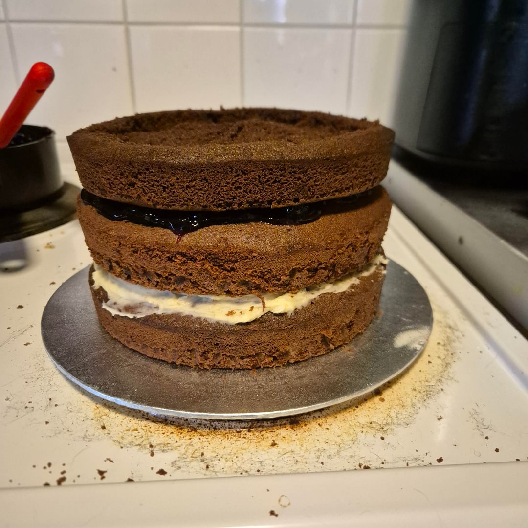 This might be the best cake ive made so far, chocolate sponges, vanilla buttercream on the bottom layer and blackberry jam on the top layer, with a mix of chocolate and vanilla buttercream for the outside and vanilla for the flowers! And blended oreos for the ‘soil’ under the flowers