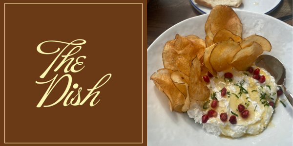 If whipped makes the dish sound light as the topping on an ice cream sundae, it’s not. Its consistency is more like cream cheese, but earthier and saltier. That’s balanced with a light honey for sweetness. Pomegranate seeds add a bright pop with a tiny acidic note.