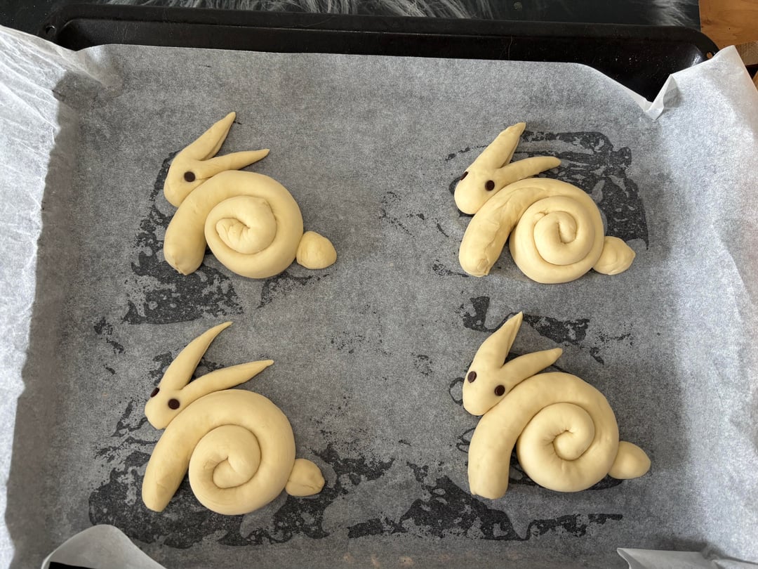 Decided on a whim to make something fun for my parents who are coming over tomorrow. Followed this (German) recipe https://www.swissmilk.ch/de/rezepte-kochideen/rezepte/LM201104\_36/zopfhasen/ and am very pleased with how they turned out.