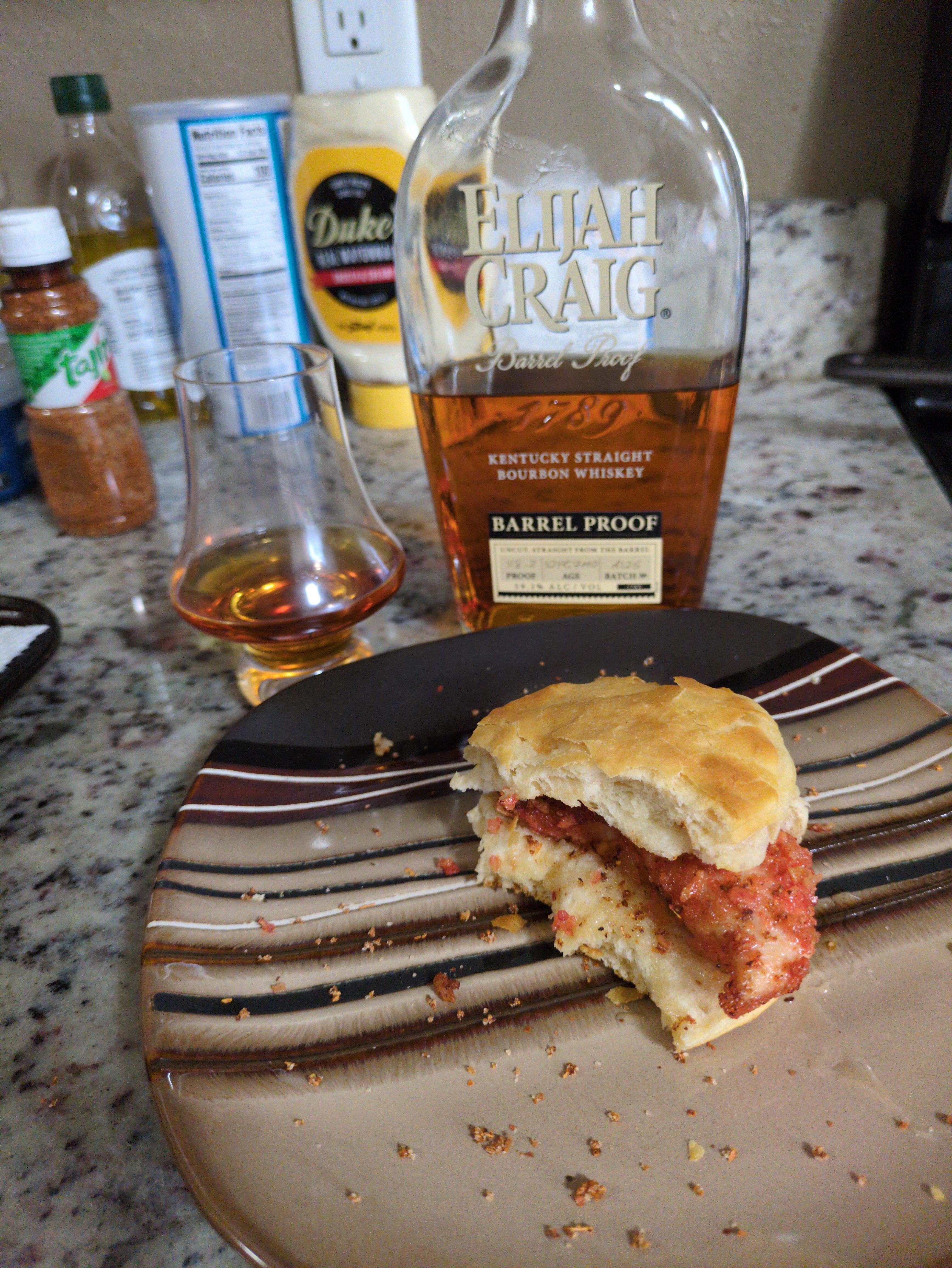 Taki fried chicken. Honey drizzle. Tajin. buttery biscuit bun and Elijah Craig 10 year.by DiShMiNiOn Dining and Cooking