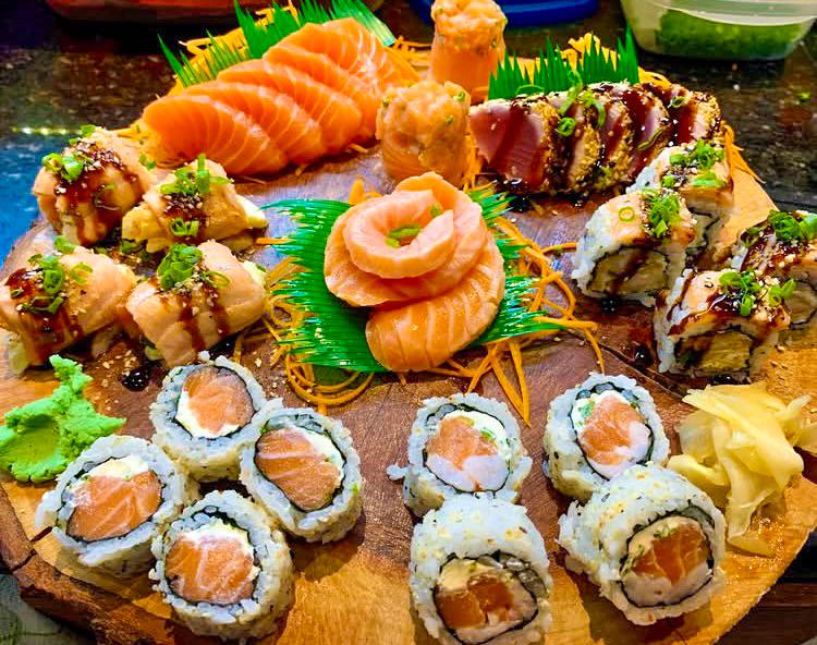 Sushi platter with salmon sashimi, salmon nigiri (some aburi with teriyaki), salmon tartar gunkan, classic salmon & cream cheese uramaki, deep-fried hot rolls, and topped specialty rolls with eel sauce, sesame, and green onions. Served with wasabi, pickled ginger, and shredded carrot garnish.