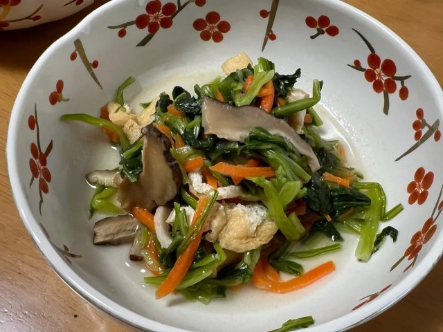 The three dishes we got were Mibuna and Kyorage, a simmered dish of local Kyoto greens and thin strips of fried tofu…